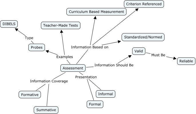 This Concept Map, created with IHMC CmapTools, has information related to: Assessment, Probes Type DIBELS, Assessment Information Based on Curriculum Based Measurement, Assessment Information Based on Standardized/Normed, Assessment Information Based on Criterion Referenced, Assessment Information Coverage Summative, Assessment Presentation Informal, Assessment Information Coverage Formative, Assessment Examples Teacher-Made Tests, Assessment Information Should Be Valid, Valid Must Be Reliable, Assessment Presentation Formal, Assessment Examples Probes