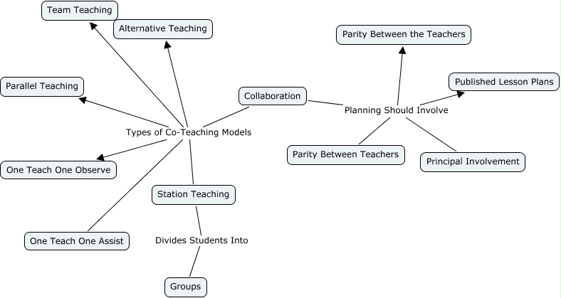 This Concept Map, created with IHMC CmapTools, has information related to: Collaboration, Collaboration Planning Should Involve Published Lesson Plans, Collaboration Types of Co-Teaching Models Alternative Teaching, Collaboration Planning Should Involve Parity Between Teachers, Collaboration Types of Co-Teaching Models One Teach One Assist, Collaboration Types of Co-Teaching Models Parallel Teaching, Collaboration Types of Co-Teaching Models Station Teaching, Collaboration Types of Co-Teaching Models One Teach One Observe, Station Teaching Divides Students Into Groups, Collaboration Planning Should Involve Principal Involvement, Collaboration Types of Co-Teaching Models Team Teaching, Collaboration Planning Should Involve Parity Between the Teachers