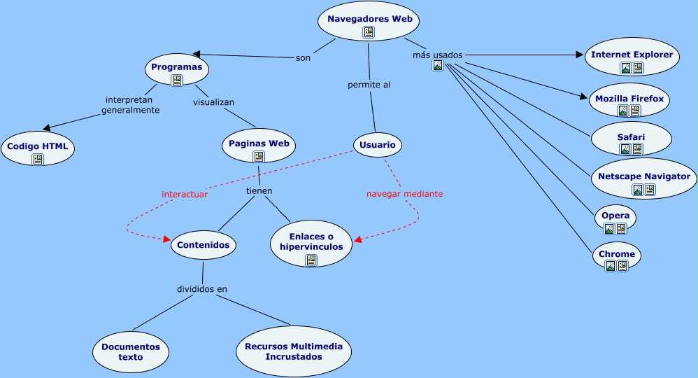 Este Cmap, tiene información relacionada con: Navegadores Web, Navegadores Web más usados Chrome, Navegadores Web más usados Mozilla Firefox, Contenidos divididos en Recursos Multimedia Incrustados, Navegadores Web más usados Internet Explorer, Usuario navegar mediante Enlaces o hipervinculos, Programas interpretan generalmente Codigo HTML, Programas visualizan Paginas Web, Paginas Web tienen Enlaces o hipervinculos, Navegadores Web más usados Safari, Navegadores Web más usados Netscape Navigator, Paginas Web tienen Contenidos, Usuario interactuar Contenidos, Navegadores Web más usados Opera, Contenidos divididos en Documentos texto, Navegadores Web permite al Usuario, Navegadores Web son Programas