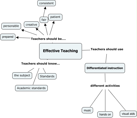 This Concept Map, created with IHMC CmapTools, has information related to: Effective Teaching, Effective Teaching Teachers should be.... creative, Effective Teaching Teachers should know... Standards, Effective Teaching Teachers should use Differentiated instruction, fair ???? consistent, Effective Teaching Teachers should be.... prepared, Effective Teaching Teachers should know... the subject, Differentiated instruction different activities music, Effective Teaching Teachers should know... Academic standards, Differentiated instruction different activities visual aids, Differentiated instruction different activities hands on, Effective Teaching Teachers should be.... personable, Effective Teaching Teachers should be.... patient, Effective Teaching Teachers should be.... fair