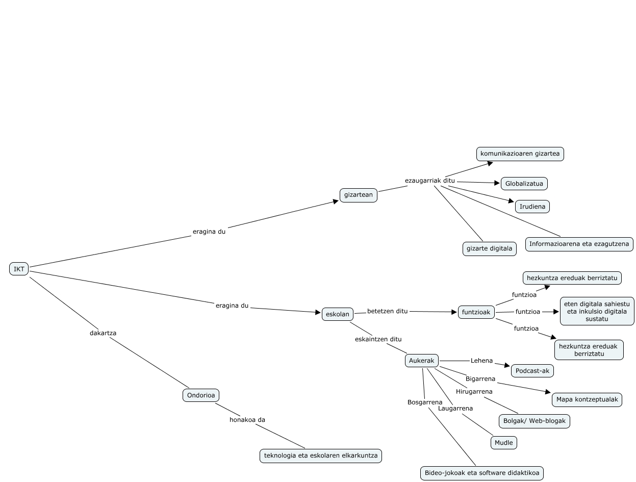 Este Cmap, tiene información relacionada con: Maria Sierra (IKT ko mapa kontzeptuala), Aukerak Bigarrena Mapa kontzeptualak, Aukerak Laugarrena Mudle, funtzioak funtzioa hezkuntza ereduak berriztatu, eskolan eskaintzen ditu Aukerak, Aukerak Lehena Podcast-ak, funtzioak funtzioa eten digitala sahiestu eta inkulsio digitala sustatu, Aukerak Hirugarrena Bolgak/ Web-blogak, IKT dakartza Ondorioa, IKT eragina du eskolan, gizartean ezaugarriak ditu Informazioarena eta ezagutzena, gizartean ezaugarriak ditu gizarte digitala, Aukerak Bosgarrena Bideo-jokoak eta software didaktikoa, gizartean ezaugarriak ditu Globalizatua, eskolan betetzen ditu funtzioak, Ondorioa honakoa da teknologia eta eskolaren elkarkuntza, funtzioak funtzioa hezkuntza ereduak berriztatu, gizartean ezaugarriak ditu Irudiena, IKT eragina du gizartean, gizartean ezaugarriak ditu komunikazioaren gizartea