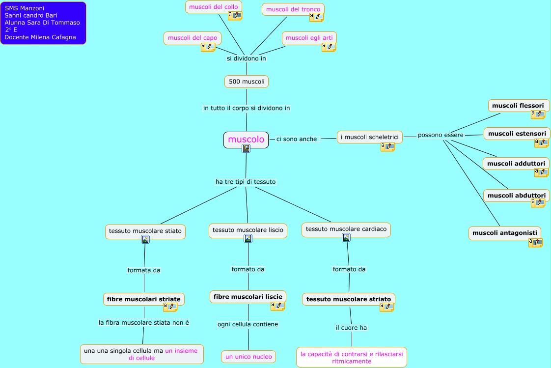 Questa Cmap, creata con IHMC CmapTools, contiene informazioni relative a: il sistema muscolare (Sara Di Tommaso), 500 muscoli si dividono in muscoli del collo, muscolo ha tre tipi di tessuto tessuto muscolare stiato, muscolo in tutto il corpo si dividono in 500 muscoli, i muscoli scheletrici possono essere muscoli antagonisti, tessuto muscolare cardiaco formato da tessuto muscolare striato, muscolo ha tre tipi di tessuto tessuto muscolare cardiaco, i muscoli scheletrici possono essere muscoli abduttori, tessuto muscolare liscio formato da fibre muscolari liscie, 500 muscoli si dividono in muscoli egli arti, i muscoli scheletrici possono essere muscoli flessori, fibre muscolari liscie ogni cellula contiene un unico nucleo, muscolo ci sono anche i muscoli scheletrici, i muscoli scheletrici possono essere muscoli estensori, i muscoli scheletrici possono essere muscoli adduttori, 500 muscoli si dividono in muscoli del tronco, 500 muscoli si dividono in muscoli del capo, tessuto muscolare stiato formata da fibre muscolari striate, tessuto muscolare striato il cuore ha la capacità di contrarsi e rilasciarsi ritmicamente, fibre muscolari striate la fibra muscolare stiata non è una una singola cellula ma un insieme di cellule, muscolo ha tre tipi di tessuto tessuto muscolare liscio