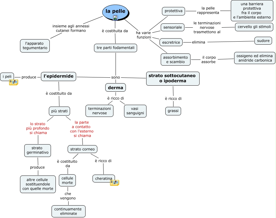 Questa Cmap, creata con IHMC CmapTools, contiene informazioni relative a: la pelle paolo, l'epidermide produce i peli, cellule morte che vengono continuamente eliminate, tre parti fodamentali sono strato sottocutaneo o ipoderma, sensoriale le terminazioni nervose trasmettono al cervello gli stlmoli, grassi è ricco di strato sottocutaneo o ipoderma, derma è ricco di vasi sanguigni, tre parti fodamentali sono derma, assorbimento e scambio il corpo assorbe ossigeno ed elimina anidride carbonica, la pelle ha varie funzioni escretrice, la pelle ha varie funzioni sensoriale, strato corneo è costituito da cellule morte, tre parti fodamentali sono l'epidermide, derma è ricco di terminazioni nervose, più strati lo strato più profondo si chiama strato germinativo, la pelle insieme agli annessi cutanei formano l'apparato tegumentario, strato germinativo produce altre cellule sostituendole con quelle morte, la pelle è costituita da tre parti fodamentali, la pelle ha varie funzioni assorbimento e scambio, escretrice elimina sudore, più strati la parte a contatto con l'esterno si chiama strato corneo