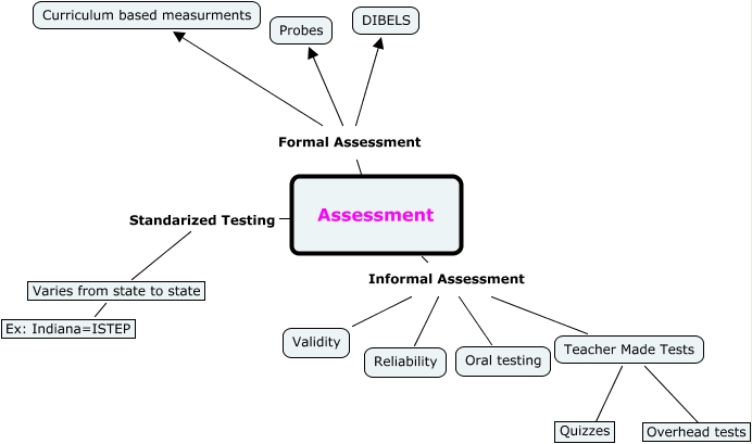 This Concept Map, created with IHMC CmapTools, has information related to: Assessment, Assessment Informal Assessment Reliability, Teacher Made Tests ???? Quizzes, Varies from state to state ???? Ex: Indiana=ISTEP, Assessment Formal Assessment Probes, Assessment Informal Assessment Teacher Made Tests, Teacher Made Tests ???? Overhead tests, Assessment Informal Assessment Validity, Assessment Informal Assessment Oral testing, Assessment Formal Assessment DIBELS, Assessment Standarized Testing Varies from state to state, Assessment Formal Assessment Curriculum based measurments