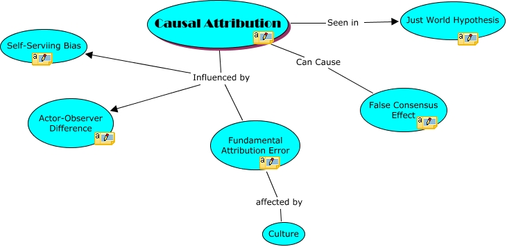 This Concept Map, created with IHMC CmapTools, has information related to: Causal Attribution, Causal Attribution Influenced by Fundamental Attribution Error, Causal Attribution Influenced by Actor-Observer Difference, Causal Attribution Influenced by Self-Serviing Bias, Causal Attribution Seen in Just World Hypothesis, Causal Attribution Can Cause False Consensus Effect, Fundamental Attribution Error affected by Culture