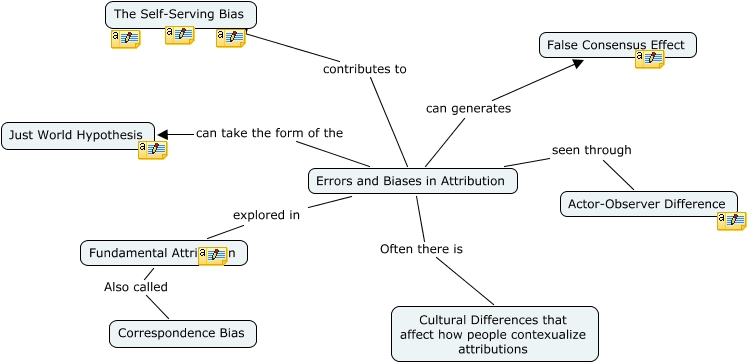 This Concept Map, created with IHMC CmapTools, has information related to: Causal Attribution, Errors and Biases in Attribution can take the form of the Just World Hypothesis, Errors and Biases in Attribution explored in Fundamental Attribution, Errors and Biases in Attribution seen through Actor-Observer Difference, Errors and Biases in Attribution contributes to The Self-Serving Bias, Errors and Biases in Attribution can generates False Consensus Effect, Errors and Biases in Attribution Often there is Cultural Differences that affect how people contexualize attributions, Fundamental Attribution Also called Correspondence Bias