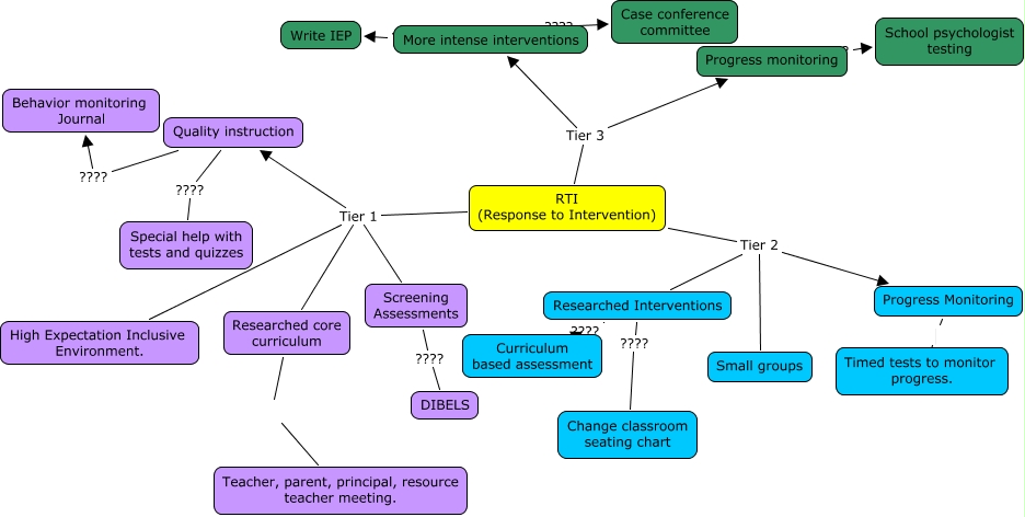 This Concept Map, created with IHMC CmapTools, has information related to: RTI, Screening Assessments ???? DIBELS, More intense interventions ???? Write IEP, RTI (Response to Intervention) Tier 2 Small groups, RTI (Response to Intervention) Tier 1 Screening Assessments, RTI (Response to Intervention) Tier 2 Progress Monitoring, Progress monitoring ???? School psychologist testing, Researched Interventions ???? Change classroom seating chart, Researched Interventions ???? Curriculum based assessment, RTI (Response to Intervention) Tier 1 Researched core curriculum, Progress Monitoring Timed tests to monitor progress., RTI (Response to Intervention) Tier 1 High Expectation Inclusive Environment., Quality instruction ???? Special help with tests and quizzes, RTI (Response to Intervention) Tier 1 Quality instruction, RTI (Response to Intervention) Tier 2 Researched Interventions, More intense interventions ???? Case conference committee, Researched core curriculum Teacher, parent, principal, resource teacher meeting., RTI (Response to Intervention) Tier 3 Progress monitoring, RTI (Response to Intervention) Tier 3 More intense interventions, Quality instruction ???? Behavior monitoring Journal