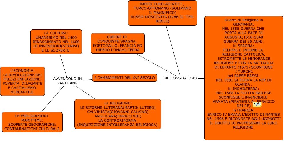 Questa Cmap, creata con IHMC CmapTools, contiene informazioni relative a: I CAMBIAMENTI DEL XVI SEC. (FABIO), I CAMBIAMENTI DEL XVI SECOLO NE CONSEGUONO Guerre di Religione in GERMANIA: NEL 1555 GUERRA CHE PORTA ALLA PACE DI AUGUSTA;1618-1648 GUERRA DEI 30 ANNI. in SPAGNA: FILIPPO II IMPONE LA RELIGIONE CATTOLICA, ESTROMETTE LE MINORANZE RELIGIOSE E CON LA BATTAGLIA DI LEPANTO (1571) SCONFIGGE I TURCHI. nei PAESE BASSI: NEL 1581 SI FORMA LA REP.DI OLANDA . in INGHILTERRA: NEL 1588 LA FLOTTA INGLESE SCONFIGGE L'INVINCIBILE ARMATA (PIRATERIA AL SERVIZIO DEI RE) in FRANCIA: ENRICO IV EMANA L'EDITTO DI NANTES NEL 1598 E RICONOSCE AGLI UGONOTTI IL DIRITTO DI PROFESSARE LA LORO RELIGIONE., I CAMBIAMENTI DEL XVI SECOLO AVVENGONO IN VARI CAMPI LA RELIGIONE: LE RIFORME:LUTERANA(MARTIN LUTERO) CALVINISTA(GIOVANNI CALVINO) ANGLICANA(ENRICO VIII) LA CONTRORIFORMA: (INQUISIZIONE;INTOLLERANZA RELIGIOSA)., I CAMBIAMENTI DEL XVI SECOLO AVVENGONO IN VARI CAMPI LA CULTURA: UMANESIMO NEL 1400 RINASCIMENTO NEL 1600 LE INVENZIONI(STAMPA) E LE SCOPERTE., I CAMBIAMENTI DEL XVI SECOLO NE CONSEGUONO GUERRE DI CONQUISTE:SPAGNA, PORTOGALLO, FRANCIA ED IMPERO D'INGHILTERRA, I CAMBIAMENTI DEL XVI SECOLO AVVENGONO IN VARI CAMPI L'ECONOMIA: LA RIVOLUZIONE DEI PREZZI;INFLAZIONE; POVERTA' DILAGANTE E CAPITALISMO MERCANTILE., I CAMBIAMENTI DEL XVI SECOLO AVVENGONO IN VARI CAMPI LE ESPLORAZIONI MARITTIME: SCOPERTE GEOGRAFICHE; CONTAMINAZIONI CULTURALI., I CAMBIAMENTI DEL XVI SECOLO NE CONSEGUONO IMPERI EURO-ASIATICI , TURCO-OTTOMANO (SOLIMANO IL MAGNIFICO) RUSSO-MOSCOVITA (IVAN IL TER- RIBILE)