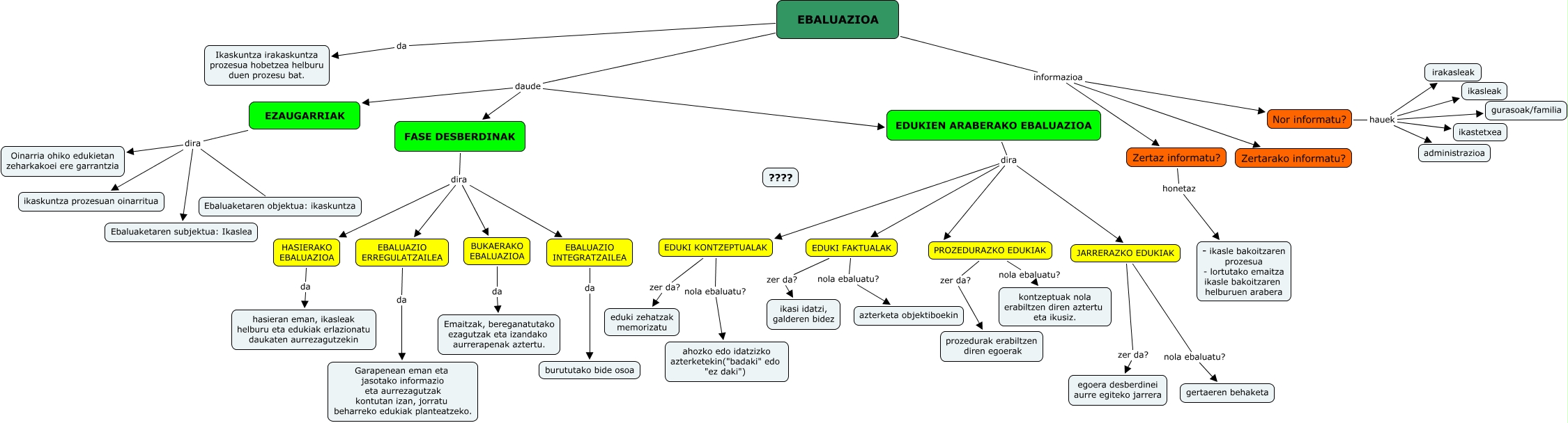 Este Cmap, tiene información relacionada con: ebaluazioa pintxo pote, EDUKIEN ARABERAKO EBALUAZIOA dira PROZEDURAZKO EDUKIAK, EDUKI KONTZEPTUALAK nola ebaluatu? ahozko edo idatzizko azterketekin("badaki" edo "ez daki"), EDUKI FAKTUALAK nola ebaluatu? azterketa objektiboekin, PROZEDURAZKO EDUKIAK zer da? prozedurak erabiltzen diren egoerak, JARRERAZKO EDUKIAK zer da? egoera desberdinei aurre egiteko jarrera, FASE DESBERDINAK dira BUKAERAKO EBALUAZIOA, HASIERAKO EBALUAZIOA da hasieran eman, ikasleak helburu eta edukiak erlazionatu daukaten aurrezagutzekin, FASE DESBERDINAK dira EBALUAZIO ERREGULATZAILEA, EZAUGARRIAK dira Ebaluaketaren objektua: ikaskuntza, EDUKIEN ARABERAKO EBALUAZIOA dira EDUKI KONTZEPTUALAK, EZAUGARRIAK dira Oinarria ohiko edukietan zeharkakoei ere garrantzia, EBALUAZIOA daude EZAUGARRIAK, EBALUAZIOA daude FASE DESBERDINAK, Nor informatu? hauek irakasleak, EDUKI KONTZEPTUALAK zer da? eduki zehatzak memorizatu, Nor informatu? hauek gurasoak/familia, EBALUAZIOA informazioa Nor informatu?, EBALUAZIOA da Ikaskuntza irakaskuntza prozesua hobetzea helburu duen prozesu bat., Nor informatu? hauek ikastetxea, EBALUAZIOA informazioa Zertarako informatu?