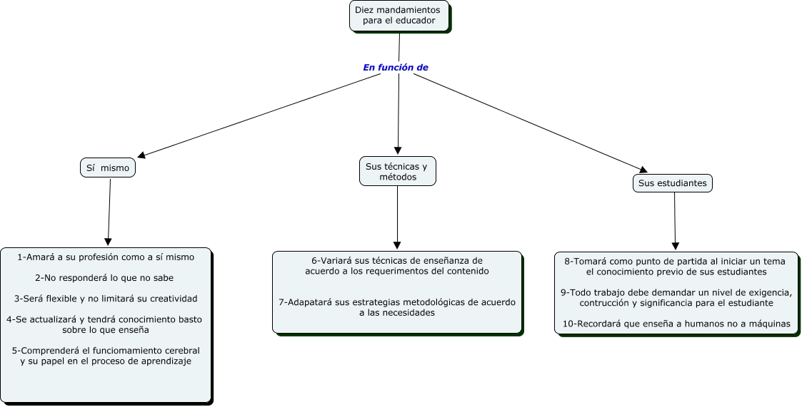 Este Cmap, tiene información relacionada con: Mapa Jorge- decalogo, Diez mandamientos para el educador En función de Sus estudiantes, Sus estudiantes ???? 8-Tomará como punto de partida al iniciar un tema el conocimiento previo de sus estudiantes 9-Todo trabajo debe demandar un nivel de exigencia, contrucción y significancia para el estudiante 10-Recordará que enseña a humanos no a máquinas, Diez mandamientos para el educador En función de Sí mismo, Diez mandamientos para el educador En función de Sus técnicas y métodos, Sus técnicas y métodos ???? 6-Variará sus técnicas de enseñanza de acuerdo a los requerimentos del contenido 7-Adapatará sus estrategias metodológicas de acuerdo a las necesidades, Sí mismo ???? 1-Amará a su profesión como a sí mismo 2-No responderá lo que no sabe 3-Será flexible y no limitará su creatividad 4-Se actualizará y tendrá conocimiento basto sobre lo que enseña 5-Comprenderá el funciomamiento cerebral y su papel en el proceso de aprendizaje