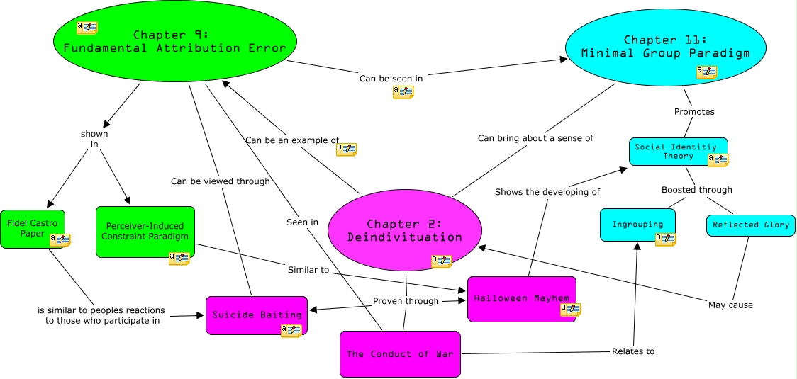 This Concept Map, created with IHMC CmapTools, has information related to: Final, Chapter 11: Minimal Group Paradigm Promotes Social Identitiy Theory, Chapter 9: Fundamental Attribution Error shown in Perceiver-Induced Constraint Paradigm, Chapter 11: Minimal Group Paradigm Can bring about a sense of Chapter 2: Deindivituation, Chapter 9: Fundamental Attribution Error Can be seen in Chapter 11: Minimal Group Paradigm, Social Identitiy Theory Boosted through Reflected Glory, The Conduct of War Relates to Ingrouping, Chapter 2: Deindivituation Proven through The Conduct of War, Perceiver-Induced Constraint Paradigm Similar to Halloween Mayhem, Chapter 9: Fundamental Attribution Error shown in Fidel Castro Paper, Chapter 9: Fundamental Attribution Error Can be viewed through Suicide Baiting, Halloween Mayhem Shows the developing of Social Identitiy Theory, Reflected Glory May cause Chapter 2: Deindivituation, Fidel Castro Paper is similar to peoples reactions to those who participate in Suicide Baiting, Chapter 2: Deindivituation Proven through Halloween Mayhem, Chapter 2: Deindivituation Proven through Suicide Baiting, Social Identitiy Theory Boosted through Ingrouping, Chapter 9: Fundamental Attribution Error Seen in The Conduct of War, Chapter 2: Deindivituation Can be an example of Chapter 9: Fundamental Attribution Error