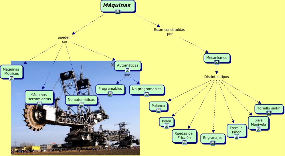 Este Cmap, tiene información relacionada con: Maquina, Mecanismos Distintos tipos Tornillo sinfin, Mecanismos Distintos tipos Estrella Piñon, Mecanismos Distintos tipos Palanca, Automáticas son No programables, Mecanismos Distintos tipos Engranajes, Máquinas pueden ser Máquinas Motrices, Máquinas Están constituidas por Mecanismos, Mecanismos Distintos tipos Ruedas de Fricción, Máquinas pueden ser Máquinas Herramientas, Máquinas pueden ser Automáticas, Mecanismos Distintos tipos Polea, Mecanismos Distintos tipos Biela Manivela, Máquinas pueden ser No automáticas, Automáticas son Programables