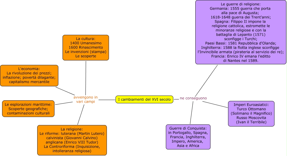 Questa Cmap, creata con IHMC CmapTools, contiene informazioni relative a: Cambiamenti del XVI secolo (Andrea), I cambiamenti del XVI secolo avvengono in vari campi Le esplorazioni marittime: Scoperte geografiche; contaminazioni culturali, I cambiamenti del XVI secolo ne conseguono Guerre di Conquista: in Portogallo, Spagna, Francia, Inghilterra, Impero, America, Asia e Africa, I cambiamenti del XVI secolo avvengono in vari campi L'economia: La rivoluzione dei prezzi; inflazione; povertà dilagante; capitalismo mercantile, I cambiamenti del XVI secolo ne conseguono Imperi Euroasiatici: Turco Ottomano (Solimano il Magnifico) Russo Moscovita (Ivan il Terribile), I cambiamenti del XVI secolo avvengono in vari campi La cultura: 1400 Umanesimo 1600 Rinascimento Le invenzioni (stampa) Le scoperte, I cambiamenti del XVI secolo ne conseguono Le guerre di religione: Germania: 1555 guerra che porta alla pace di Augusta; 1618-1648 guerra dei Trent'anni; Spagna: Filippo II impone la religione cattolica, estromette le minoranze religiose e con la battaglia di Lepanto (1571) sconfigge i Turchi; Paesi Bassi: 1581 Repubblica d'Olanda; Inghilterra: 1588 la flotta inglese sconfigge l'Invincibile armata (pirateria al servizio dei re); Francia: Enrico IV emana l'editto di Nantes nel 1589., I cambiamenti del XVI secolo avvengono in vari campi La religione: Le riforme: luterana (Martin Lutero) calvinista (Giovanni Calvino) anglicana (Enrico VIII Tudor) La Controriforma (Inquisizione, intolleranza religiosa)