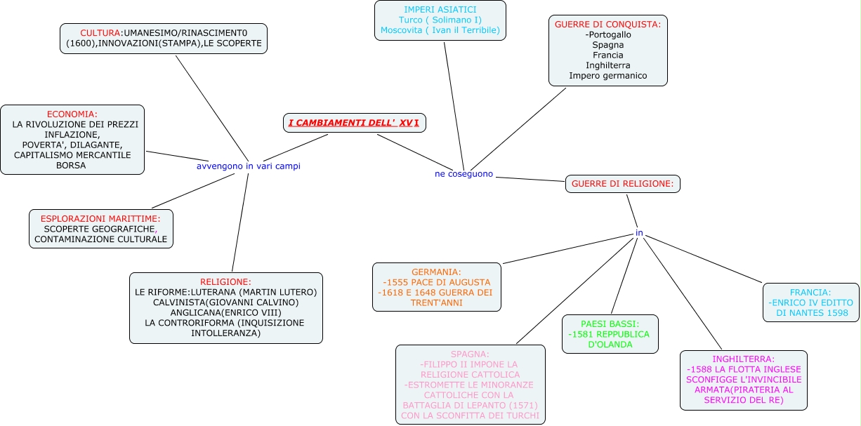 Questa Cmap, creata con IHMC CmapTools, contiene informazioni relative a: i cambiamenti del xvi di rosalba, I CAMBIAMENTI DELL' XVI ne coseguono GUERRE DI RELIGIONE:, I CAMBIAMENTI DELL' XVI ne coseguono IMPERI ASIATICI Turco ( Solimano I) Moscovita ( Ivan il Terribile), GUERRE DI RELIGIONE: in FRANCIA: -ENRICO IV EDITTO DI NANTES 1598, I CAMBIAMENTI DELL' XVI avvengono in vari campi CULTURA:UMANESIMO/RINASCIMENT0 (1600),INNOVAZIONI(STAMPA),LE SCOPERTE, GUERRE DI RELIGIONE: in GERMANIA: -1555 PACE DI AUGUSTA -1618 E 1648 GUERRA DEI TRENT'ANNI, I CAMBIAMENTI DELL' XVI avvengono in vari campi ESPLORAZIONI MARITTIME: SCOPERTE GEOGRAFICHE, CONTAMINAZIONE CULTURALE, GUERRE DI RELIGIONE: in SPAGNA: -FILIPPO II IMPONE LA RELIGIONE CATTOLICA -ESTROMETTE LE MINORANZE CATTOLICHE CON LA BATTAGLIA DI LEPANTO (1571) CON LA SCONFITTA DEI TURCHI, GUERRE DI RELIGIONE: in PAESI BASSI: -1581 REPPUBLICA D'OLANDA, I CAMBIAMENTI DELL' XVI avvengono in vari campi RELIGIONE: LE RIFORME:LUTERANA (MARTIN LUTERO) CALVINISTA(GIOVANNI CALVINO) ANGLICANA(ENRICO VIII) LA CONTRORIFORMA (INQUISIZIONE INTOLLERANZA), GUERRE DI RELIGIONE: in INGHILTERRA: -1588 LA FLOTTA INGLESE SCONFIGGE L'INVINCIBILE ARMATA(PIRATERIA AL SERVIZIO DEL RE), I CAMBIAMENTI DELL' XVI avvengono in vari campi ECONOMIA: LA RIVOLUZIONE DEI PREZZI INFLAZIONE, POVERTA', DILAGANTE, CAPITALISMO MERCANTILE BORSA, I CAMBIAMENTI DELL' XVI ne coseguono GUERRE DI CONQUISTA: -Portogallo Spagna Francia Inghilterra Impero germanico
