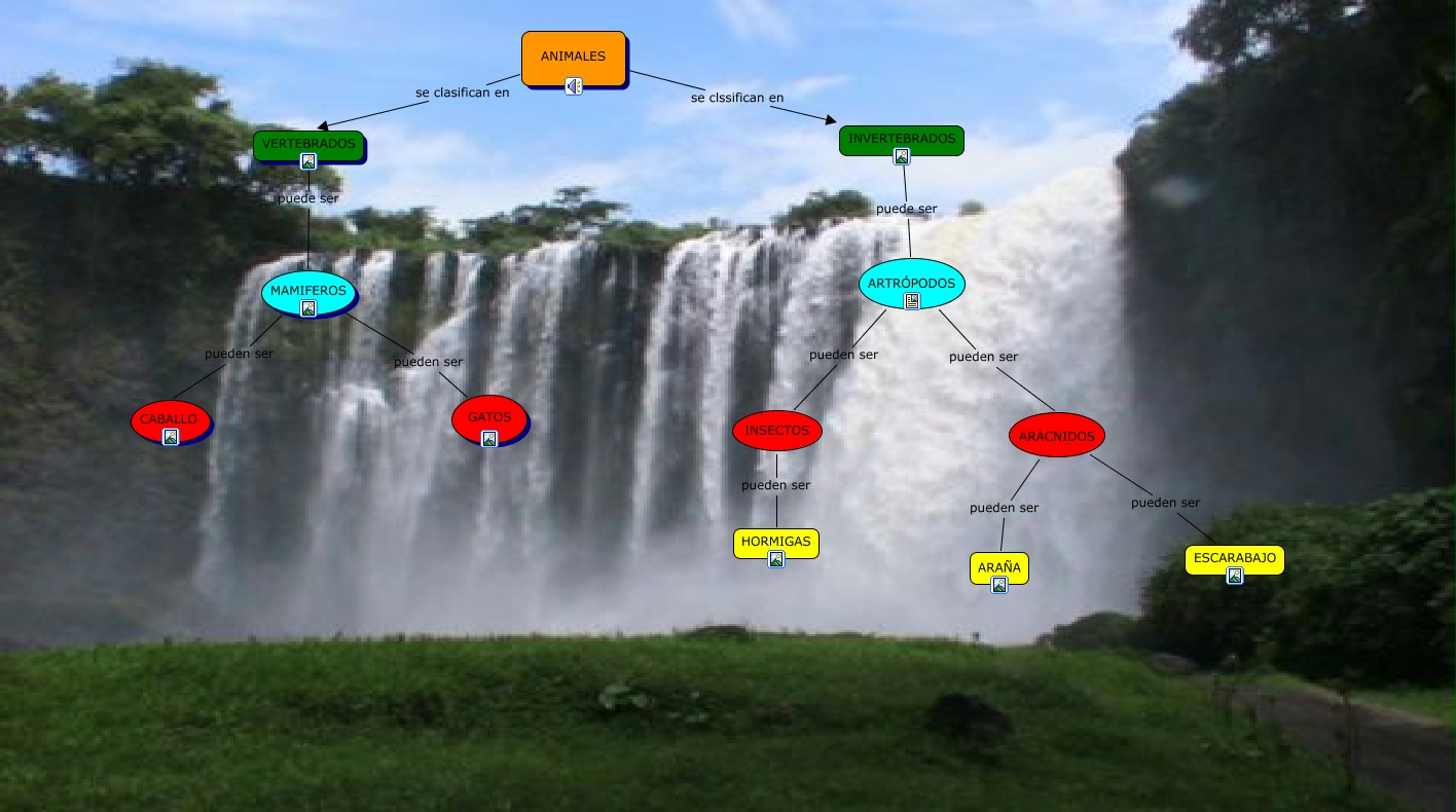 Este Cmap, tiene información relacionada con: animales vertebrados e invertebrados, INSECTOS pueden ser HORMIGAS, MAMIFEROS pueden ser CABALLO, MAMIFEROS pueden ser GATOS, ANIMALES se clasifican en VERTEBRADOS, VERTEBRADOS puede ser MAMIFEROS, ARTRÓPODOS pueden ser INSECTOS, ARÀCNIDOS pueden ser ARAÑA, ANIMALES se clssifican en INVERTEBRADOS, ARTRÓPODOS pueden ser ARÀCNIDOS, INVERTEBRADOS puede ser ARTRÓPODOS, ARÀCNIDOS pueden ser ESCARABAJO