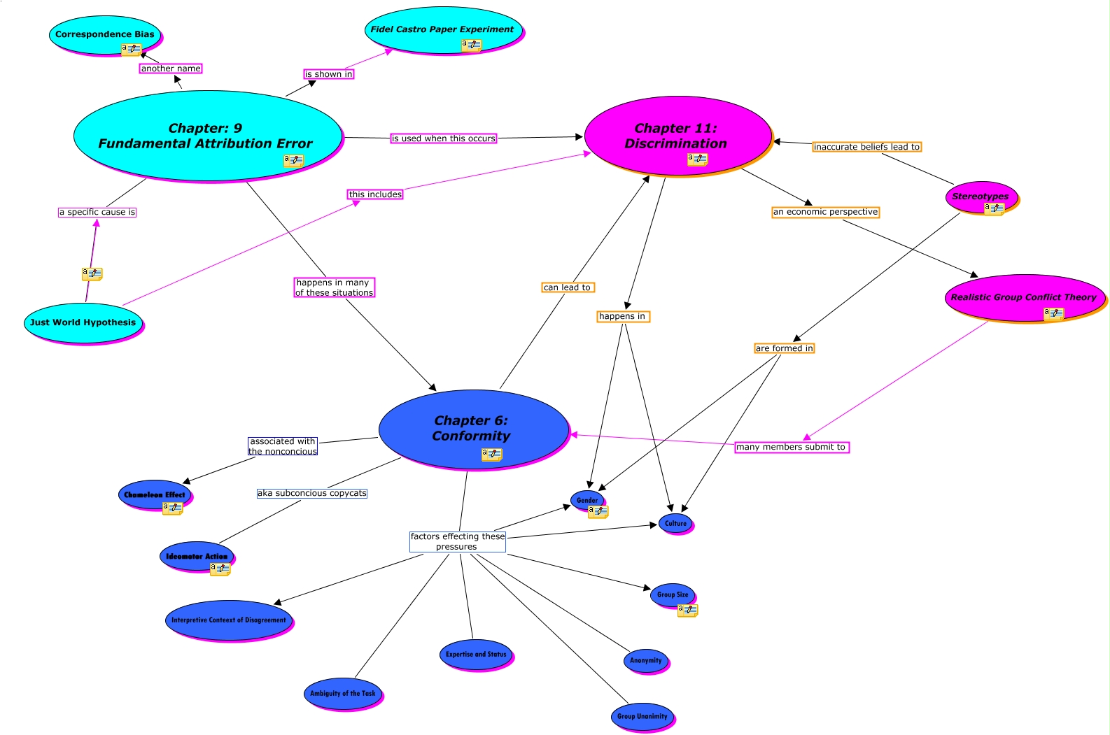 This Concept Map, created with IHMC CmapTools, has information related to: Final, Chapter 6: Conformity associated with the nonconcious Chameleon Effect, Chapter 6: Conformity factors effecting these pressures Group Size, Chapter 6: Conformity factors effecting these pressures Expertise and Status, Stereotypes are formed in Gender, Realistic Group Conflict Theory many members submit to Chapter 6: Conformity, Chapter 6: Conformity factors effecting these pressures Ambiguity of the Task, Stereotypes inaccurate beliefs lead to Chapter 11: Discrimination, Chapter 6: Conformity factors effecting these pressures Gender, Chapter 6: Conformity can lead to Chapter 11: Discrimination, Chapter 6: Conformity factors effecting these pressures Interpretive Conteext of Disagreement, Chapter: 9 Fundamental Attribution Error a specific cause is Just World Hypothesis, Chapter 6: Conformity aka subconcious copycats Ideomotor Action, Chapter: 9 Fundamental Attribution Error is used when this occurs Chapter 11: Discrimination, Just World Hypothesis this includes Chapter 11: Discrimination, Stereotypes are formed in Culture, Chapter: 9 Fundamental Attribution Error another name Correspondence Bias, Chapter 6: Conformity factors effecting these pressures Anonymity, Chapter: 9 Fundamental Attribution Error is shown in Fidel Castro Paper Experiment, Chapter 11: Discrimination happens in Culture, Chapter 11: Discrimination happens in Gender