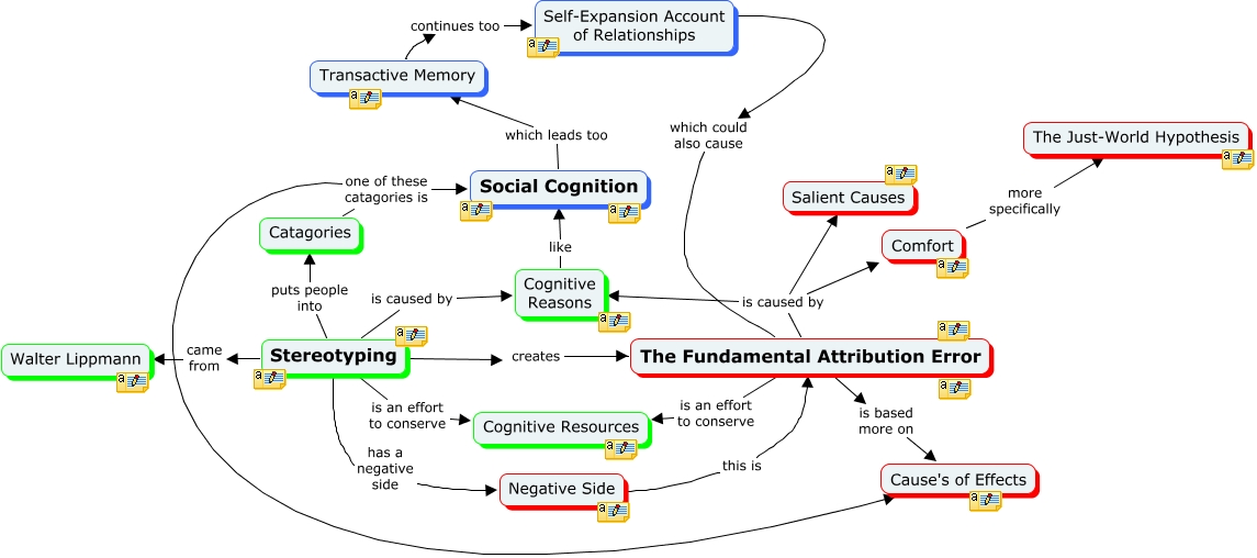 This Concept Map, created with IHMC CmapTools, has information related to: Final, Negative Side this is The Fundamental Attribution Error, The Fundamental Attribution Error is caused by Cognitive Reasons, The Fundamental Attribution Error is caused by Comfort, The Fundamental Attribution Error is based more on Cause's of Effects, Stereotyping is an effort to conserve Cognitive Resources, Stereotyping has a negative side Negative Side, Stereotyping puts people into Catagories, Social Cognition which leads too Transactive Memory, The Fundamental Attribution Error is caused by Salient Causes, Transactive Memory continues too Self-Expansion Account of Relationships, Catagories one of these catagories is Social Cognition, Stereotyping creates The Fundamental Attribution Error, Self-Expansion Account of Relationships which could also cause The Fundamental Attribution Error, The Fundamental Attribution Error is an effort to conserve Cognitive Resources, Comfort more specifically The Just-World Hypothesis, Stereotyping is caused by Cognitive Reasons, Cognitive Reasons like Social Cognition, Catagories one of these catagories is Cause's of Effects, Stereotyping came from Walter Lippmann