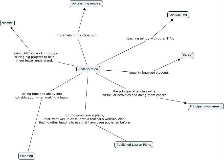 This Concept Map, created with IHMC CmapTools, has information related to: Collaboration, Collaboration taking time and ability into consideration when making a lesson Planning, Collaboration more help in the classroom co-teaching models, Collaboration the principal attending extra curricular activities and doing room checks Principal involvement, Collaboration putting good lesson plans, that went well in class, onto a teacher's website. Also finding other lessons to use that have been published before Published Lesson Plans, Collaboration equality between students Parity, Collaboration having children work in groups during big projects to help them better understand. groups, Collaboration teaching jointly with other T.A's co-teaching