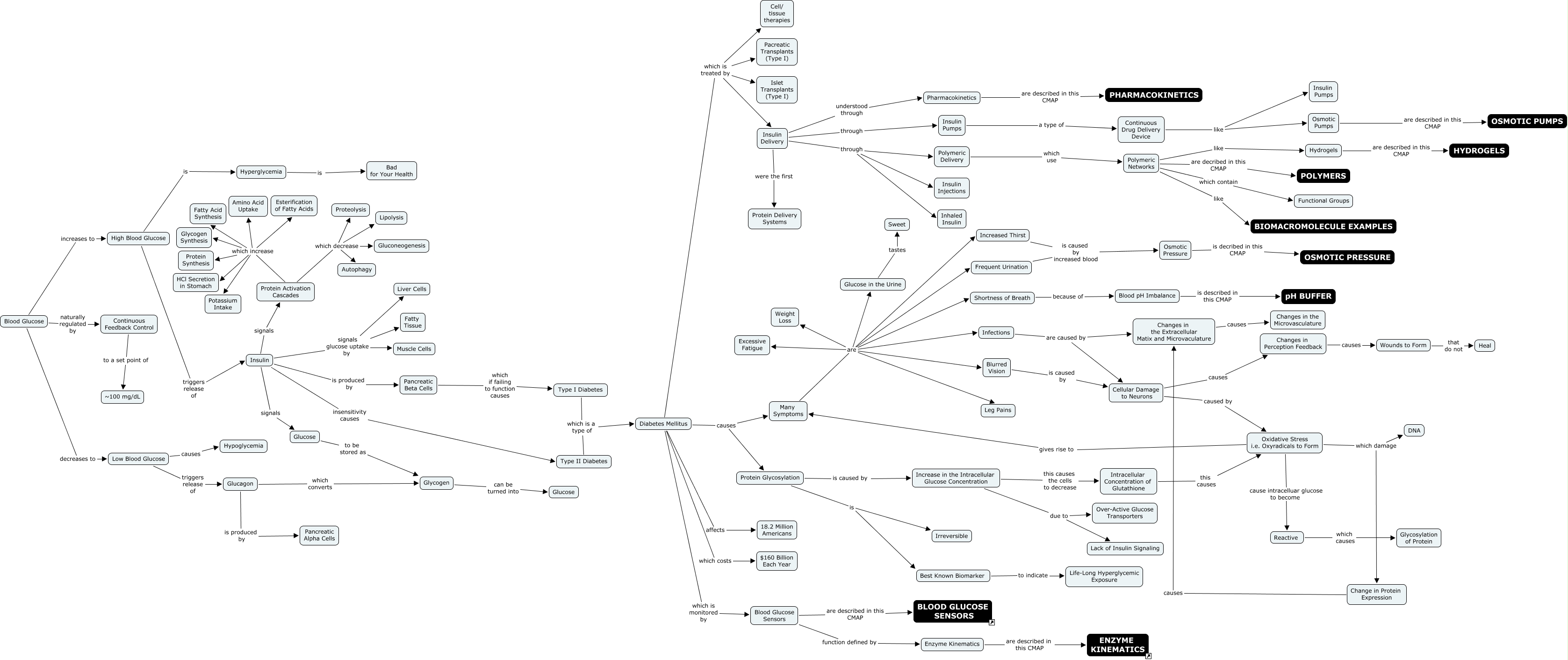 This Concept Map, created with IHMC CmapTools, has information related to: B1102 Diabetes Concept Map.cmap, Diabetes Mellitus which is treated by Cell/ tissue therapies, Diabetes Mellitus which costs $160 Billion Each Year, Insulin Delivery through Polymeric Delivery, Hydrogels are described in this CMAP HYDROGELS, Continuous Feedback Control to a set point of ~100 mg/dL, Changes in the Extracellular Matix and Microvaculature causes Changes in the Microvasculature, Changes in Perception Feedback causes Wounds to Form, Many Symptoms are Excessive Fatigue, Reactive which causes Glycosylation of Protein, Increase in the Intracellular Glucose Concentration due to Lack of Insulin Signaling, Continuous Drug Delivery Device like Insulin Pumps, Protein Activation Cascades which decrease Gluconeogenesis, Change in Protein Expression causes Changes in the Extracellular Matix and Microvaculature, Blood Glucose Sensors are described in this CMAP BLOOD GLUCOSE SENSORS, Best Known Biomarker to indicate Life-Long Hyperglycemic Exposure, Many Symptoms are Shortness of Breath, Intracellular Concentration of Glutathione this causes Oxidative Stress i.e. Oxyradicals to Form, Insulin Delivery understood through Pharmacokinetics, Polymeric Networks which contain Functional Groups, Diabetes Mellitus which is treated by Islet Transplants (Type I)