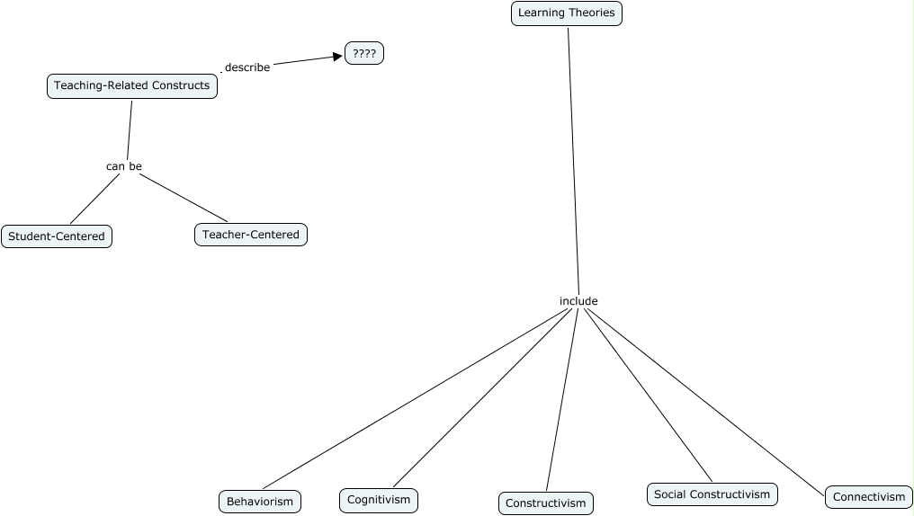 This Concept Map, created with IHMC CmapTools, has information related to: Learning Theory, Learning Theories include Behaviorism, Teaching-Related Constructs can be Student-Centered, Learning Theories include Connectivism, Teaching-Related Constructs describe ????, Teaching-Related Constructs can be Teacher-Centered, Learning Theories include Constructivism, Learning Theories include Social Constructivism, Learning Theories include Cognitivism