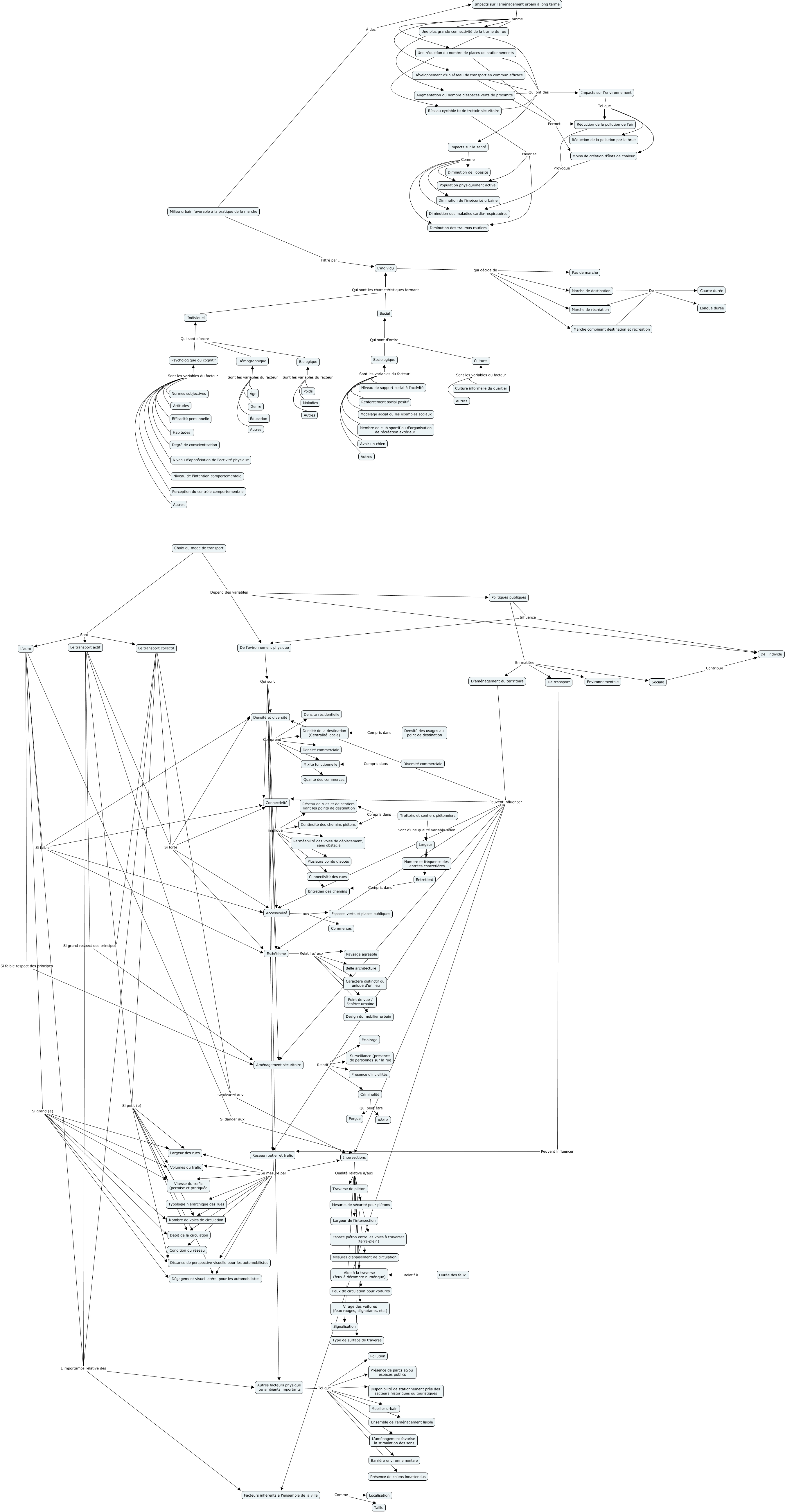 Cette carte de concepts créée avec IHMC CmapTools traite de: Révision 1, Sociologique Qui sont d'ordre Social, Réseau routier et trafic Se mesure par Intersections, Intersections Qualité relative à/aux Aide à la traverse (feux à décompte numérique), Perception du contrôle comportementale Sont les variables du facteur Psychologique ou cognitif, Niveau de support social à l'activité Sont les variables du facteur Sociologique, Marche de destination De Courte durée, L'individu qui décide de Marche de récréation, L'individu qui décide de Pas de marche, Individuel Qui sont les charactéristiques formant L'individu, Développement d'un réseau de transport en commun efficace Qui ont des Impacts sur l'environnement, D'aménagement du terrritoire Peuvent influencer Intersections, L'auto Si grand (e) Débit de la circulation, Développement d'un réseau de transport en commun efficace Permet Réduction de la pollution de l'air, Membre de club sportif ou d'organisation de récréation extérieur Sont les variables du facteur Sociologique, Trottoirs et sentiers piétonniers Sont d'une qualité variable selon Nombre et fréquence des entrées charretières, Trottoirs et sentiers piétonniers Compris dans Réseau de rues et de sentiers liant les points de destination, Facteurs inhérents à l'ensemble de la ville Comme Taille, D'aménagement du terrritoire Peuvent influencer Densité et diversité, Diversité commerciale Compris dans Mixité fonctionnelle, Impacts sur l'environnement Tel que Réduction de la pollution par le bruit