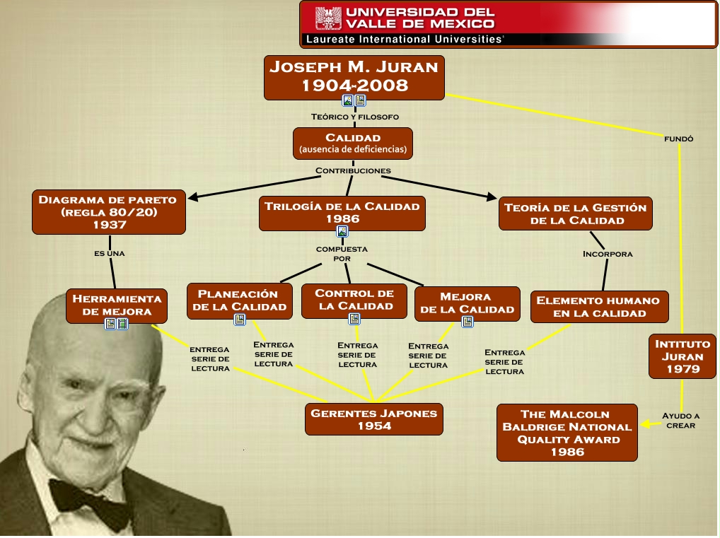 Este Cmap, tiene información relacionada con: Joseph Juran, Control de la Calidad Entrega serie de lectura Gerentes Japones 1954, Joseph M. Juran 1904-2008 Teórico y filosofo Calidad (ausencia de deficiencias), Herramienta de mejora entrega serie de lectura Gerentes Japones 1954, Intituto Juran 1979 Ayudo a crear The Malcoln Baldrige National Quality Award 1986, Mejora de la Calidad Entrega serie de lectura Gerentes Japones 1954, Planeación de la Calidad Entrega serie de lectura Gerentes Japones 1954, Calidad (ausencia de deficiencias) Contribuciones Diagrama de pareto (regla 80/20) 1937, Calidad (ausencia de deficiencias) Contribuciones Teoría de la Gestión de la Calidad, Calidad (ausencia de deficiencias) Contribuciones Trilogía de la Calidad 1986, Teoría de la Gestión de la Calidad Incorpora Elemento humano en la calidad, Trilogía de la Calidad 1986 compuesta por Planeación de la Calidad, Trilogía de la Calidad 1986 compuesta por Mejora de la Calidad, Diagrama de pareto (regla 80/20) 1937 es una Herramienta de mejora, Elemento humano en la calidad Entrega serie de lectura Gerentes Japones 1954, Trilogía de la Calidad 1986 compuesta por Control de la Calidad, Joseph M. Juran 1904-2008 fundó Intituto Juran 1979