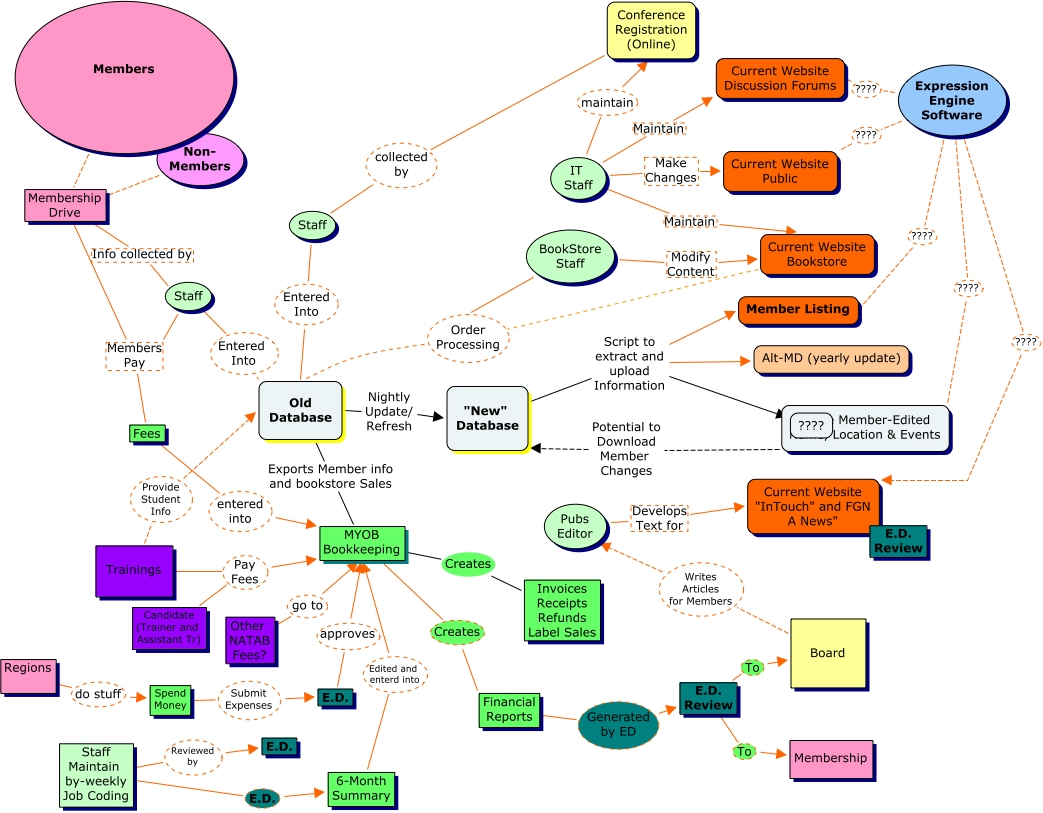 This Concept Map, created with IHMC CmapTools, has information related to: Involvement of FGNA Databases, Pubs Editor Develops Text for Current Website "InTouch" and FGN A News", Spend Money Submit Expenses E.D., Conference Registration (Online) collected by Staff, MYOB Bookkeeping Creates Invoices Receipts Refunds Label Sales, IT Staff maintain Conference Registration (Online), Expression Engine Software ???? Current Website "InTouch" and FGN A News", Staff Members Pay Fees, Board Writes Articles for Members Pubs Editor, Expression Engine Software ???? Member Listing, BookStore Staff Order Processing Old Database, Members ???? Membership Drive, MYOB Bookkeeping Creates Financial Reports, "New" Database Script to extract and upload Information ????, "New" Database Script to extract and upload Information Member Listing, 6-Month Summary Edited and enterd into MYOB Bookkeeping, Staff Maintain by-weekly Job Coding Reviewed by E.D., Financial Reports Generated by ED E.D. Review, Non- Members ???? Membership Drive, Staff Entered Into Old Database, IT Staff Maintain Current Website Discussion Forums