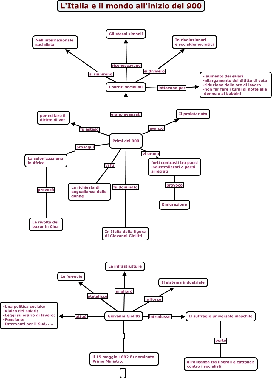 Questa Cmap, creata con IHMC CmapTools, contiene informazioni relative a: l'italia e il mondo all'inizio del 900', i partiti socialisti si divisero In rivoluzionari e socialdemocratici, Primi del 900 vi erano forti contrasti tra paesi industralizzati e paesi arretrati, Primi del 900 avanzò Il proletariato, Primi del 900 fu dominato In Italia dalla figura di Giovanni Giolitti, Giovanni Giolitti rafforzò Il sistema industriale, La colonizazzione in Africa provocò La rivolta dei boxer in Cina, Giovanni Giolitti attuò -Una politica sociale; -Rialzo dei salari; -Leggi su orario di lavoro; -Pensione; -Interventi per il Sud, ...., Giovanni Giolitti introdusse Il suffragio universale maschile, Giovanni Giolitti, Giovanni Giolitti migliorò Le infrastrutture, Primi del 900 vi fu La richiesta di eugualianza delle donne, Giovanni Giolitti statalizzò Le ferrovie, i partiti socialisti riconoscevano Gli stessi simboli, i partiti socialisti lottavano per - aumento dei salari -allargamento del dititto di voto -riduzione delle ore di lavoro -non far fare i turni di notte alle donne e ai babbini, Primi del 900 erano avanzati i partiti socialisti, Primi del 900 fu esteso per esitare il diritto di vot, Il suffragio universale maschile portò all'alleanza tra liberali e cattolici: contro i socialisti., Primi del 900 proseguì La colonizazzione in Africa, i partiti socialisti si riunirono Nell'internazionale socialista, forti contrasti tra paesi industralizzati e paesi arretrati provocò Emigrazione