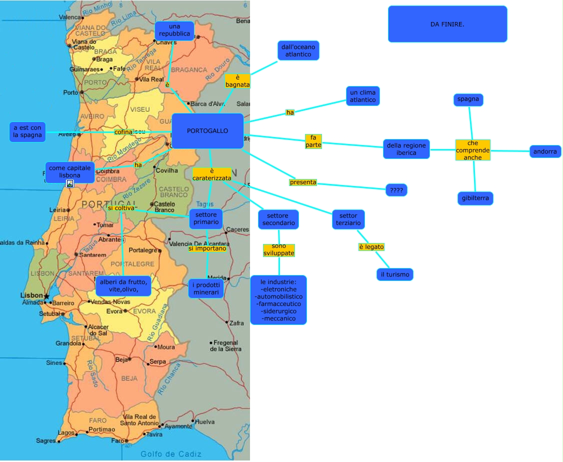 Questa Cmap, creata con IHMC CmapTools, contiene informazioni relative a: portogallo (schiraldi), della regione iberica che comprende anche spagna, settore primario è caraterizzata settor terziario, PORTOGALLO fa parte della regione iberica, settore primario si coltiva alberi da frutto, vite,olivo,, PORTOGALLO cofina a est con la spagna, PORTOGALLO presenta ????, della regione iberica che comprende anche andorra, PORTOGALLO è una repubblica, della regione iberica che comprende anche gibilterra, settore primario è caraterizzata settore secondario, PORTOGALLO ha come capitale lisbona, PORTOGALLO ha un clima atlantico, settor terziario è legato il turismo, settore primario si importano i prodotti minerari, settore secondario sono sviluppate le industrie: -eletroniche -automobilistico -farmacceutico -siderurgico -meccanico, settore primario è caraterizzata PORTOGALLO