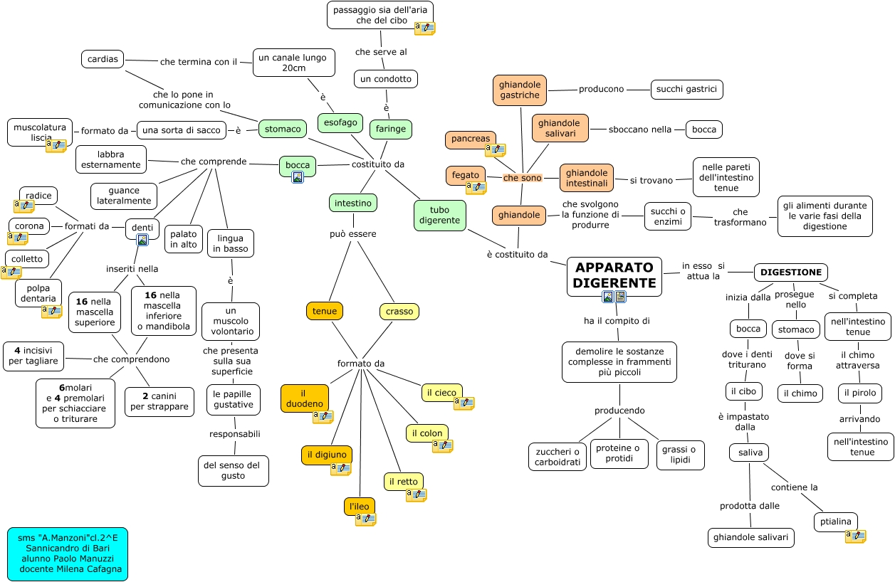 Questa Cmap, creata con IHMC CmapTools, contiene informazioni relative a: apparato digerente paolo, bocca dove i denti triturano il cibo, crasso formato da il colon, DIGESTIONE prosegue nello stomaco, ghiandole che sono ghiandole gastriche, tenue formato da il cieco, bocca che comprende labbra esternamente, un condotto che serve al passaggio sia dell'aria che del cibo, tubo digerente costituito da stomaco, ghiandole salivari sboccano nella bocca, ghiandole gastriche producono succhi gastrici, tenue formato da il duodeno, tubo digerente costituito da bocca, cardias che lo pone in comunicazione con lo stomaco, il cibo è impastato dalla saliva, ghiandole che sono ghiandole intestinali, demolire le sostanze complesse in frammenti più piccoli producendo proteine o protidi, tenue formato da il retto, tubo digerente costituito da esofago, 16 nella mascella inferiore o mandibola che comprendono 2 canini per strappare, denti formati da corona