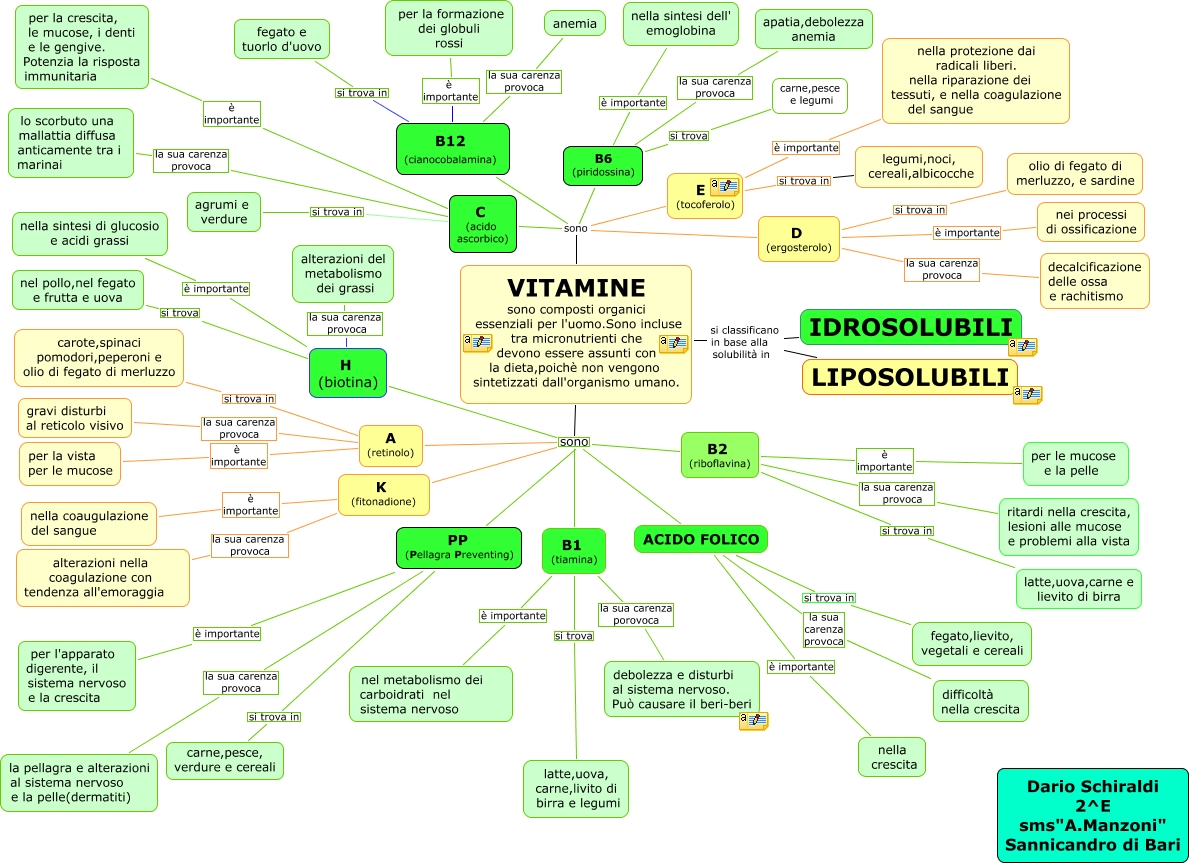 Questa Cmap, creata con IHMC CmapTools, contiene informazioni relative a: LE VITAMINE, ritardi nella crescita, lesioni alle mucose e problemi alla vista la sua carenza provoca B2 (riboflavina), D (ergosterolo) si trova in olio di fegato di merluzzo, e sardine, H (biotina) sono B1 (tiamina), E (tocoferolo) si trova in legumi,noci, cereali,albicocche, B12 (cianocobalamina) sono VITAMINE sono composti organici essenziali per l'uomo.Sono incluse tra micronutrienti che devono essere assunti con la dieta,poichè non vengono sintetizzati dall'organismo umano., decalcificazione delle ossa e rachitismo la sua carenza provoca D (ergosterolo), B2 (riboflavina) sono B1 (tiamina), B12 (cianocobalamina) si trova in fegato e tuorlo d'uovo, K (fitonadione) sono B1 (tiamina), H (biotina) sono PP (Pellagra Preventing), K (fitonadione) la sua carenza provoca alterazioni nella coagulazione con tendenza all'emoraggia, C (acido ascorbico) sono B6 (piridossina), D (ergosterolo) sono E (tocoferolo), A (retinolo) sono PP (Pellagra Preventing), VITAMINE sono composti organici essenziali per l'uomo.Sono incluse tra micronutrienti che devono essere assunti con la dieta,poichè non vengono sintetizzati dall'organismo umano. sono PP (Pellagra Preventing), debolezza e disturbi al sistema nervoso. Può causare il beri-beri la sua carenza porovoca B1 (tiamina), H (biotina) si trova nel pollo,nel fegato e frutta e uova, lo scorbuto una mallattia diffusa anticamente tra i marinai la sua carenza provoca C (acido ascorbico), ACIDO FOLICO si trova in fegato,lievito, vegetali e cereali, VITAMINE sono composti organici essenziali per l'uomo.Sono incluse tra micronutrienti che devono essere assunti con la dieta,poichè non vengono sintetizzati dall'organismo umano. si classificano in base alla solubilità in LIPOSOLUBILI