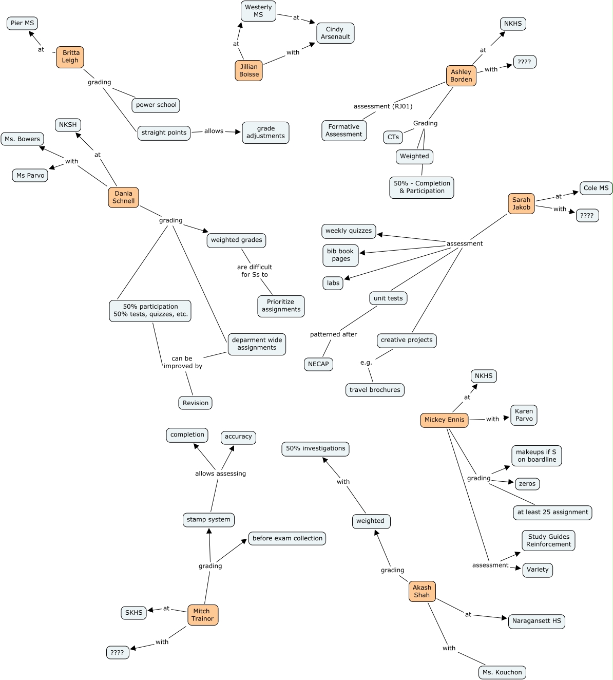 This Concept Map, created with IHMC CmapTools, has information related to: RJ01 - Assessment and Grading, Mickey Ennis grading at least 25 assignment, Akash Shah at Naragansett HS, Britta Leigh grading power school, Mickey Ennis assessment Study Guides Reinforcement, Dania Schnell grading 50% participation 50% tests, quizzes, etc., Britta Leigh grading straight points, Mitch Trainor at SKHS, weighted grades are difficult for Ss to Prioritize assignments, Sarah Jakob at Cole MS, Akash Shah with Ms. Kouchon, deparment wide assignments can be improved by Revision, Dania Schnell with Ms. Bowers, Jillian Boisse with Cindy Arsenault, Sarah Jakob with ????, Akash Shah grading weighted, Mitch Trainor grading before exam collection, Sarah Jakob assessment weekly quizzes, Sarah Jakob assessment creative projects, Sarah Jakob assessment unit tests, Mickey Ennis grading makeups if S on boardline