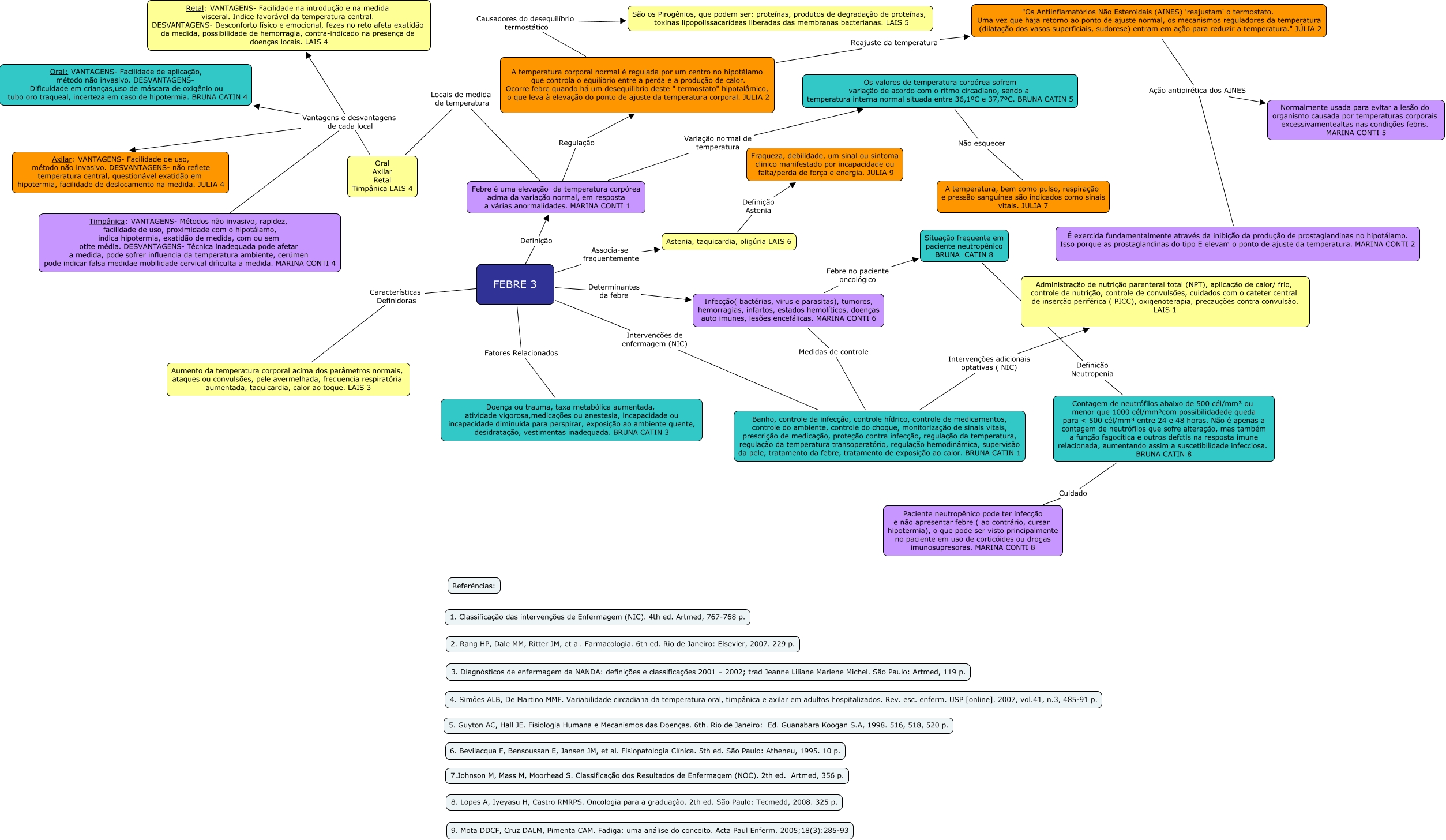 Esse mapa conceitual, produzido no IHMC CmapTools, tem a informação relacionada a: Febre 3, Infecção( bactérias, virus e parasitas), tumores, hemorragias, infartos, estados hemolíticos, doenças auto imunes, lesões encefálicas. MARINA CONTI 6 Febre no paciente oncológico Situação frequente em paciente neutropênico BRUNA CATIN 8, FEBRE 3 Associa-se frequentemente Astenia, taquicardia, oligúria LAIS 6, Febre é uma elevação da temperatura corpórea acima da variação normal, em resposta a várias anormalidades. MARINA CONTI 1 Locais de medida de temperatura Oral Axilar Retal Timpânica LAIS 4, "Os Antiinflamatórios Não Esteroidais (AINES) 'reajustam' o termostato. Uma vez que haja retorno ao ponto de ajuste normal, os mecanismos reguladores da temperatura (dilatação dos vasos superficiais, sudorese) entram em ação para reduzir a temperatura." JÚLIA 2 Ação antipirética dos AINES É exercida fundamentalmente através da inibição da produção de prostaglandinas no hipotálamo. Isso porque as prostaglandinas do tipo E elevam o ponto de ajuste da temperatura. MARINA CONTI 2, FEBRE 3 Fatores Relacionados Doença ou trauma, taxa metabólica aumentada, atividade vigorosa,medicações ou anestesia, incapacidade ou incapacidade diminuida para perspirar, exposição ao ambiente quente, desidratação, vestimentas inadequada. BRUNA CATIN 3, FEBRE 3 Características Definidoras Aumento da temperatura corporal acima dos parâmetros normais, ataques ou convulsões, pele avermelhada, frequencia respiratória aumentada, taquicardia, calor ao toque. LAIS 3, Oral Axilar Retal Timpânica LAIS 4 Vantagens e desvantagens de cada local Oral: VANTAGENS- Facilidade de aplicação, método não invasivo. DESVANTAGENS- Dificuldade em crianças,uso de máscara de oxigênio ou tubo oro traqueal, incerteza em caso de hipotermia. BRUNA CATIN 4, A temperatura corporal normal é regulada por um centro no hipotálamo que controla o equilíbrio entre a perda e a produção de calor. Ocorre febre quando há um desequilibrio deste " termostato" hipotalâmico, o que leva à elevação do ponto de ajuste da temperatura corporal. JULIA 2 Causadores do desequilíbrio termostático São os Pirogênios, que podem ser: proteínas, produtos de degradação de proteínas, toxinas lipopolissacarídeas liberadas das membranas bacterianas. LAIS 5, Febre é uma elevação da temperatura corpórea acima da variação normal, em resposta a várias anormalidades. MARINA CONTI 1 Variação normal de temperatura Os valores de temperatura corpórea sofrem variação de acordo com o ritmo circadiano, sendo a temperatura interna normal situada entre 36,1ºC e 37,7ºC. BRUNA CATIN 5, Banho, controle da infecção, controle hídrico, controle de medicamentos, controle do ambiente, controle do choque, monitorização de sinais vitais, prescrição de medicação, proteção contra infecção, regulação da temperatura, regulação da temperatura transoperatório, regulação hemodinâmica, supervisão da pele, tratamento da febre, tratamento de exposição ao calor. BRUNA CATIN 1 Intervenções adicionais optativas ( NIC) Administração de nutrição parenteral total (NPT), aplicação de calor/ frio, controle de nutrição, controle de convulsões, cuidados com o cateter central de inserção periférica ( PICC), oxigenoterapia, precauções contra convulsão. LAIS 1, Infecção( bactérias, virus e parasitas), tumores, hemorragias, infartos, estados hemolíticos, doenças auto imunes, lesões encefálicas. MARINA CONTI 6 Medidas de controle Banho, controle da infecção, controle hídrico, controle de medicamentos, controle do ambiente, controle do choque, monitorização de sinais vitais, prescrição de medicação, proteção contra infecção, regulação da temperatura, regulação da temperatura transoperatório, regulação hemodinâmica, supervisão da pele, tratamento da febre, tratamento de exposição ao calor. BRUNA CATIN 1, "Os Antiinflamatórios Não Esteroidais (AINES) 'reajustam' o termostato. Uma vez que haja retorno ao ponto de ajuste normal, os mecanismos reguladores da temperatura (dilatação dos vasos superficiais, sudorese) entram em ação para reduzir a temperatura." JÚLIA 2 Ação antipirética dos AINES Normalmente usada para evitar a lesão do organismo causada por temperaturas corporais excessivamentealtas nas condições febris. MARINA CONTI 5, FEBRE 3 Determinantes da febre Infecção( bactérias, virus e parasitas), tumores, hemorragias, infartos, estados hemolíticos, doenças auto imunes, lesões encefálicas. MARINA CONTI 6, Oral Axilar Retal Timpânica LAIS 4 Vantagens e desvantagens de cada local Axilar: VANTAGENS- Facilidade de uso, método não invasivo. DESVANTAGENS- não reflete temperatura central, questionável exatidão em hipotermia, facilidade de deslocamento na medida. JULIA 4, Oral Axilar Retal Timpânica LAIS 4 Vantagens e desvantagens de cada local Timpânica: VANTAGENS- Métodos não invasivo, rapidez, facilidade de uso, proximidade com o hipotálamo, indica hipotermia, exatidão de medida, com ou sem otite média. DESVANTAGENS- Técnica inadequada pode afetar a medida, pode sofrer influencia da temperatura ambiente, cerúmen pode indicar falsa medidae mobilidade cervical dificulta a medida. MARINA CONTI 4, Contagem de neutrófilos abaixo de 500 cél/mm³ ou menor que 1000 cél/mm³com possibilidadede queda para < 500 cél/mm³ entre 24 e 48 horas. Não é apenas a contagem de neutrófilos que sofre alteração, mas também a função fagocítica e outros defctis na resposta imune relacionada, aumentando assim a suscetibilidade infecciosa. BRUNA CATIN 8 Cuidado Paciente neutropênico pode ter infecção e não apresentar febre ( ao contrário, cursar hipotermia), o que pode ser visto principalmente no paciente em uso de corticóides ou drogas imunosupresoras. MARINA CONTI 8, FEBRE 3 Intervenções de enfermagem (NIC) Banho, controle da infecção, controle hídrico,