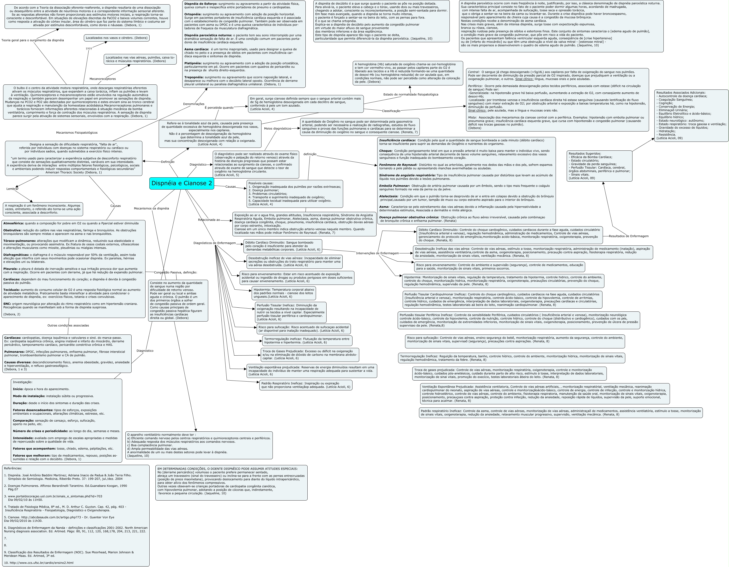 Esse mapa conceitual, produzido no IHMC CmapTools, tem a informação relacionada a: Dispnéia e Cianose 2, Designa a sensação de dificuldade respiratória, "falta de ar", referida por indivíduos com doenças no sistema respiratório ou cardíaco ou por indivíduos sadios, quando submetidos a exercício físico intenso. “um termo usado para caracterizar a experiência subjetiva de desconforto respiratório que consiste de sensações qualitativamente distintas, variáveis em sua intensidade. A experiência deriva de interações entre múltiplos fatores fisiológicos, psicológicos, sociais e ambientais podendo induzir respostas comportamentais e fisiológicas secundárias” American Thoracic Society (Debora, 1) Mecanismos Fisiopatológicos O bulbo é o centro da atividade motora respiratória, onde descargas respiratórias eferentes ativam os músculos respiratórios, que expandem a caixa torácica, inflam os pulmões e levam à ventilação. Quimioreceptores e mecanoreceptores estão envolvidos na regulação automática da respiração e também parecem desempenhar um papel em promover as sensações de dispnéia. Mudanças na PCO2 e PO2 são detectadas por quimioreceptores e estes enviam sina ao tronco cerebral que ajusta a respiração e manutenção da homeostase acidobásica.Mecanorreceptores pulmonares e torácicos fornecem informações aferentes relacionadas à situação mecânica da bomba ventilatória, comprimento e força de contração dos músculos respiratórios. A sensação de dispnéia parece surgir pela ativação de sistemas sensoriais, envolvidos com a respiração. (Debora, 1), Atmosférica: quando a composição for pobre em O2 ou quando a Pparcial estiver diminuída Obstrutiva: redução do calibre nas vias respiratórias, faringe e bronquíolos. As obstruções bronquiolares são sempre mistas e aparecem na asma e nas bronquiolites. Tóraco-pulmonares: alterações que modificam a dinâmica, reduzindo sua elasticidade e movimentação, ou provocando assimetria. Ex:fratura de ossos costais externos, cifoescoliose e alterações musculares como miosite, pleudinias ou mialgias intensas. Diafragmáticas: o diafragma é o músculo responsável por 50% da ventilação, assim toda afecção que interfira com seus movimentos pode ocasionar dispnéia. Ex:paralisia, hérnias e elevações uni ou bilaterais. Pleurais: a pleura é dotada de inervação sensitiva e sua irritação provoca dor que aumenta com a inspiração. Ocorre em pacientes com derrame, já que há redução da expansão pulmonar. Cardíacas: dependem do mau funcionamento do coração; a dispnéia é devida à congestão passiva do pulmão. Teciduais: aumento do consumo celular de O2 é uma resposta fisiológica normal ao aumento de atividade metabólica. Praticamente basta intensificar a atividade para condicionar o aparecimento de dispnéia, ex: exercícios físicos, tetania e crises convulsivas. SNC: origem neurológica por alteração do ritmo respiratório como em hipertensão craniana. Psicogênicas quando se manifestam sob a forma de dispnéia suspirosa. (Debora, 2) Outras condições associadas Cardíacas: cardiopatias, doença isquêmica e valvulares e sind. do marca-passo. Ex: cardiopatia isquêmica crônica, angina instável e infarto do miocárdio, derrame pericárdico, tamponamento cardíaco, pericardite constritiva crônica e HAS. Pulmonares: DPOC, infecções pulmonares, enfisema pulmonar, fibrose intersticial pulmonar, tromboembolismo pulmonar e CA de pulmão. Causas diversas: descondicionamento físico, anemia obesidade, gravidez, ansiedade e hiperventilação, e refluxo gastroesofágico. (Debora, 1 e 3), O bulbo é o centro da atividade motora respiratória, onde descargas respiratórias eferentes ativam os músculos respiratórios, que expandem a caixa torácica, inflam os pulmões e levam à ventilação. Quimioreceptores e mecanoreceptores estão envolvidos na regulação automática da respiração e também parecem desempenhar um papel em promover as sensações de dispnéia. Mudanças na PCO2 e PO2 são detectadas por quimioreceptores e estes enviam sina ao tronco cerebral que ajusta a respiração e manutenção da homeostase acidobásica.Mecanorreceptores pulmonares e torácicos fornecem informações aferentes relacionadas à situação mecânica da bomba ventilatória, comprimento e força de contração dos músculos respiratórios. A sensação de dispnéia parece surgir pela ativação de sistemas sensoriais, envolvidos com a respiração. (Debora, 1) ???? Localizados nos vasos e cérebro. (Debora), Dispnéia e Cianose 2 Diagnósticos de Enfermagem Risco para sufocação: Risco acentuado de sufocaçao acidental (ar disponível para inalação inadequado). (Letícia Acioli, 6), Resultados Sugeridos: - Eficácia da Bomba Cardíaca; - Estado circulatório; - Gravidade da perda sanguínea; - Perfusão Tissular: Cardíaca, cerebral, órgãos abdominais, periférica e pulmonar; - Sinais vitais. (Letícia Acioli, 09) Outros resultados Resultados Associados Adicionais: - Autocontrole da doença cardíaca; - Coagulação Sanguínea; - Cognição; - Conservação de Energia; - Eliminaçaõ Urinária; - Equilíbrio Eletrolítico e ácido-básico; - Equilíbrio hídrico; - Estado neurológico: autônomo; - Estado respiratório: troca gasosa e ventilação; - Gravidade do excesso de líquidos; - Hidratação; - Resistência. (Letícia Acioli, 09), Dispnéia e Cianose 2 Diagnóstico O diagnóstico pode ser realizado através do exame físico (observação e palpação do retorno venoso) através da história de doenças pregressas que possam estar relacionadas ao surgimento da cianose, e confirmado através de exame de sangue que detecte o teor de oxigênio na hemoglobina circulante. (Letícia Acioli, 5), Dispnéia e Cianose 2 Definição Refere-se à tonalidade azul da pele, causada pela presença de quantidade excessiva de hemoglobina desoxigenada nos vasos, especialmente nos cap