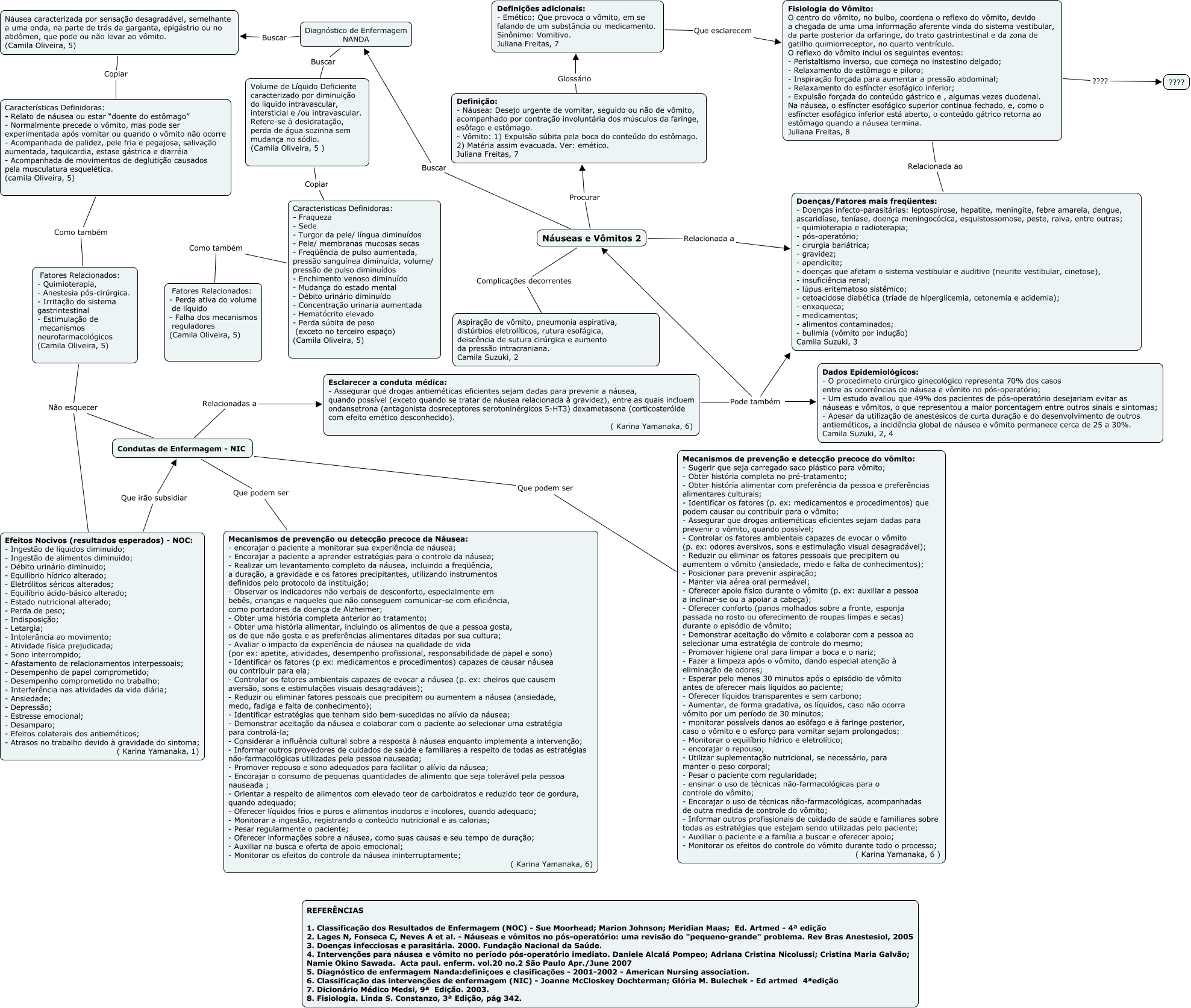 Esse mapa conceitual, produzido no IHMC CmapTools, tem a informação relacionada a: Náuseas e Vômitos 2, Definições adicionais: - Emético: Que provoca o vômito, em se falando de um substância ou medicamento. Sinônimo: Vomitivo. Juliana Freitas, 7 Que esclarecem Fisiologia do Vômito: O centro do vômito, no bulbo, coordena o reflexo do vômito, devido a chegada de uma uma informação aferente vinda do sistema vestibular, da parte posterior da orfaringe, do trato gastrintestinal e da zona de gatilho quimiorreceptor, no quarto ventrículo. O reflexo do vômito inclui os seguintes eventos: - Peristaltismo inverso, que começa no instestino delgado; - Relaxamento do estômago e piloro; - Inspiração forçada para aumentar a pressão abdominal; - Relaxamento do esfíncter esofágico inferior; - Expulsão forçada do conteúdo gástrico e , algumas vezes duodenal. Na náusea, o esfíncter esofágico superior continua fechado, e, como o esfíncter esofágico inferior está aberto, o conteúdo gátrico retorna ao estômago quando a náusea termina. Juliana Freitas, 8, Fisiologia do Vômito: O centro do vômito, no bulbo, coordena o reflexo do vômito, devido a chegada de uma uma informação aferente vinda do sistema vestibular, da parte posterior da orfaringe, do trato gastrintestinal e da zona de gatilho quimiorreceptor, no quarto ventrículo. O reflexo do vômito inclui os seguintes eventos: - Peristaltismo inverso, que começa no instestino delgado; - Relaxamento do estômago e piloro; - Inspiração forçada para aumentar a pressão abdominal; - Relaxamento do esfíncter esofágico inferior; - Expulsão forçada do conteúdo gástrico e , algumas vezes duodenal. Na náusea, o esfíncter esofágico superior continua fechado, e, como o esfíncter esofágico inferior está aberto, o conteúdo gátrico retorna ao estômago quando a náusea termina. Juliana Freitas, 8 ???? ????, Características Definidoras: - Relato de náusea ou estar “doente do estômago” - Normalmente precede o vômito, mas pode ser experimentada após vomitar ou quando o vômito não ocorre - Acompanhada de palidez, pele fria e pegajosa, salivação aumentada, taquicardia, estase gástrica e diarréia - Acompanhada de movimentos de deglutição causados pela musculatura esquelética. (camila Oliveira, 5) Como também Fatores Relacionados: - Quimioterapia, - Anestesia pós-cirúrgica. - Irritação do sistema gastrintestinal - Estimulação de mecanismos neurofarmacológicos (Camila Oliveira, 5), Diagnóstico de Enfermagem NANDA Buscar Volume de Líquido Deficiente caracterizado por diminuição do liquido intravascular, intersticial e /ou intravascular. Refere-se à desidratação, perda de água sozinha sem mudança no sódio. (Camila Oliveira, 5 ), Náusea caracterizada por sensação desagradável, semelhante a uma onda, na parte de trás da garganta, epigástrio ou no abdômen, que pode ou não levar ao vômito. (Camila Oliveira, 5) Copiar Características Definidoras: - Relato de náusea ou estar “doente do estômago” - Normalmente precede o vômito, mas pode ser experimentada após vomitar ou quando o vômito não ocorre - Acompanhada de palidez, pele fria e pegajosa, salivação aumentada, taquicardia, estase gástrica e diarréia - Acompanhada de movimentos de deglutição causados pela musculatura esquelética. (camila Oliveira, 5), Definição: - Náusea: Desejo urgente de vomitar, seguido ou não de vômito, acompanhado por contração involuntária dos músculos da faringe, esôfago e estômago. - Vômito: 1) Expulsão súbita pela boca do conteúdo do estômago. 2) Matéria assim evacuada. Ver: emético. Juliana Freitas, 7 Glossário Definições adicionais: - Emético: Que provoca o vômito, em se falando de um substância ou medicamento. Sinônimo: Vomitivo. Juliana Freitas, 7, Náuseas e Vômitos 2 Buscar Diagnóstico de Enfermagem NANDA, Condutas de Enfermagem - NIC Que podem ser Mecanismos de prevenção e detecção precoce do vômito: - Sugerir que seja carregado saco plástico para vômito; - Obter história completa no pré-tratamento; - Obter história alimentar com preferência da pessoa e preferências alimentares culturais; - Identificar os fatores (p. ex: medicamentos e procedimentos) que podem causar ou contribuir para o vômito; - Assegurar que drogas antieméticas eficientes sejam dadas para prevenir o vômito, quando possível; - Controlar os fatores ambientais capazes de evocar o vômito (p. ex: odores aversivos, sons e estimulação visual desagradável); - Reduzir ou eliminar os fatores pessoais que precipitem ou aumentem o vômito (ansiedade, medo e falta de conhecimentos); - Posicionar para prevenir aspiração; - Manter via aérea oral permeável; - Oferecer apoio físico durante o vômito (p. ex: auxiliar a pessoa a inclinar-se ou a apoiar a cabeça); - Oferecer conforto (panos molhados sobre a fronte, esponja passada no rosto ou oferecimento de roupas limpas e secas) durante o episódio de vômito; - Demonstrar aceitação do vômito e colaborar com a pessoa ao selecionar uma estratégia de controle do mesmo; - Promover higiene oral para limpar a boca e o nariz; - Fazer a limpeza após o vômito, dando especial atenção à eliminação de odores; - Esperar pelo menos 30 minutos após o episódio de vômito antes de oferecer mais líquidos ao paciente; - Oferecer líquidos transparentes e sem carbono; - Aumentar, de forma gradativa, os líquidos, caso não ocorra vômito por um período de 30 minutos; - monitorar possíveis danos ao esôfago e à faringe posterior, caso o vômito e o esforço para vomitar sejam prolongados; - Monitorar o equilíbrio hídrico e eletrolítico; - encorajar o repouso; - Utilizar suplementação nutricional, se necessário, para manter o peso corporal; - Pesar o paciente com regularidade; - ensinar o uso de técnicas não-farmacológicas para o controle do vômito; - Encorajar o uso de técnicas não-farmacológicas, acompanhadas de outra