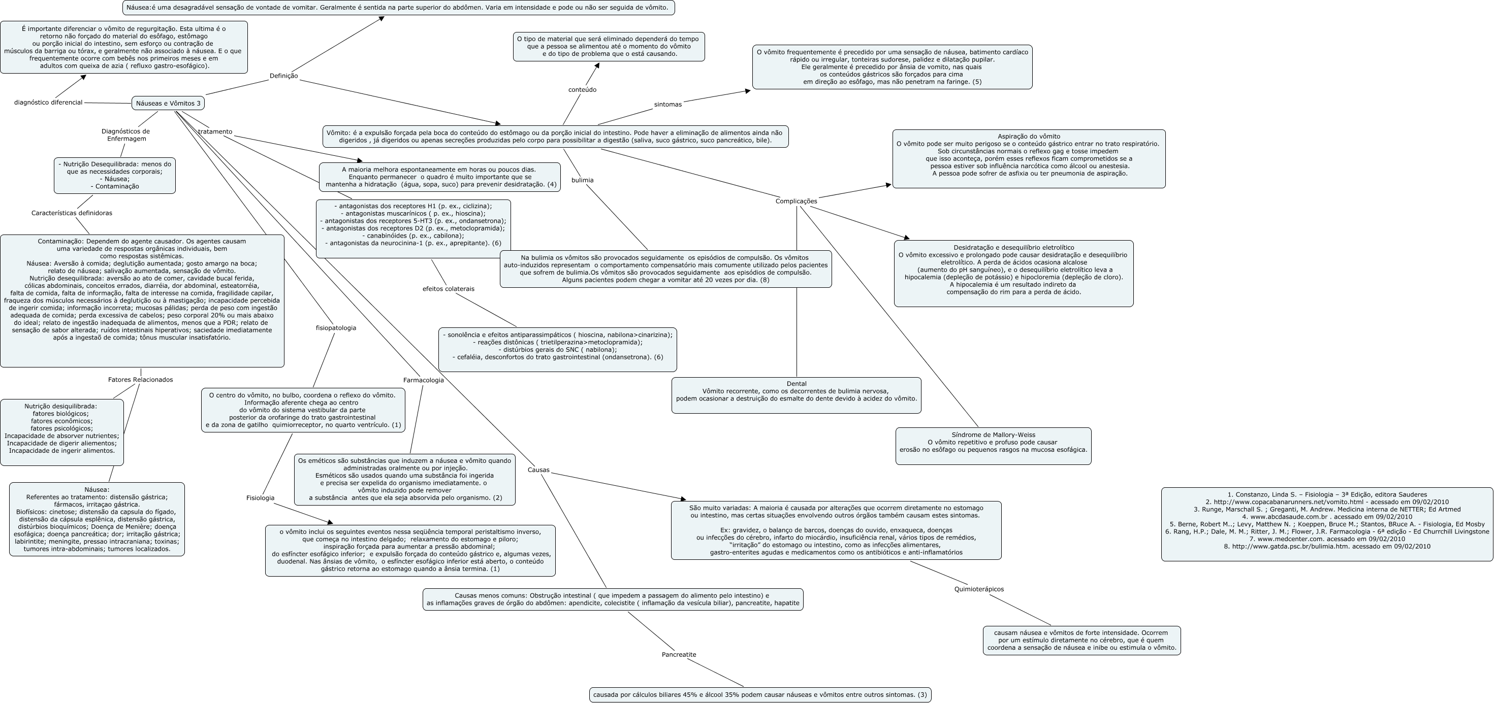 Esse mapa conceitual, produzido no IHMC CmapTools, tem a informação relacionada a: Náuseas e Vômitos 3, Contaminação: Dependem do agente causador. Os agentes causam uma variedade de respostas orgânicas individuais, bem como respostas sistêmicas. Náusea: Aversão à comida; deglutição aumentada; gosto amargo na boca; relato de náusea; salivação aumentada, sensação de vômito. Nutrição desequilibrada: aversão ao ato de comer, cavidade bucal ferida, cólicas abdominais, conceitos errados, diarréia, dor abdominal, esteatorréia, falta de comida, falta de informação, falta de interesse na comida, fragilidade capilar, fraqueza dos músculos necessários à deglutição ou à mastigação; incapacidade percebida de ingerir comida; informação incorreta; mucosas pálidas; perda de peso com ingestão adequada de comida; perda excessiva de cabelos; peso corporal 20% ou mais abaixo do ideal; relato de ingestão inadequada de alimentos, menos que a PDR; relato de sensação de sabor alterada; ruídos intestinais hiperativos; saciedade imediatamente após a ingestaõ de comida; tônus muscular insatisfatório. Fatores Relacionados Nutrição desiquilibrada: fatores biológicos; fatores econômicos; fatores psicológicos; Incapacidade de absorver nutrientes; Incapacidade de digerir aliementos; Incapacidade de ingerir alimentos., Vômito: é a expulsão forçada pela boca do conteúdo do estômago ou da porção inicial do intestino. Pode haver a eliminação de alimentos ainda não digeridos , já digeridos ou apenas secreções produzidas pelo corpo para possibilitar a digestão (saliva, suco gástrico, suco pancreático, bile). sintomas O vômito frequentemente é precedido por uma sensação de náusea, batimento cardíaco rápido ou irregular, tonteiras sudorese, palidez e dilatação pupilar. Ele geralmente é precedido por ânsia de vomito, nas quais os conteúdos gástricos são forçados para cima em direção ao esôfago, mas não penetram na faringe. (5), Náuseas e Vômitos 3 tratamento - antagonistas dos receptores H1 (p. ex., ciclizina); - antagonistas muscarínicos ( p. ex., hioscina); - antagonistas dos receptores 5-HT3 (p. ex., ondansetrona); - antagonistas dos receptores D2 (p. ex., metoclopramida); - canabinóides (p. ex., cabilona); - antagonistas da neurocinina-1 (p. ex., aprepitante). (6), Náuseas e Vômitos 3 Definição Náusea:é uma desagradável sensação de vontade de vomitar. Geralmente é sentida na parte superior do abdômen. Varia em intensidade e pode ou não ser seguida de vômito., Vômito: é a expulsão forçada pela boca do conteúdo do estômago ou da porção inicial do intestino. Pode haver a eliminação de alimentos ainda não digeridos , já digeridos ou apenas secreções produzidas pelo corpo para possibilitar a digestão (saliva, suco gástrico, suco pancreático, bile). Complicações Aspiração do vômito O vômito pode ser muito perigoso se o conteúdo gástrico entrar no trato respiratório. Sob circunstâncias normais o reflexo gag e tosse impedem que isso aconteça, porém esses reflexos ficam comprometidos se a pessoa estiver sob influência narcótica como álcool ou anestesia. A pessoa pode sofrer de asfixia ou ter pneumonia de aspiração., Vômito: é a expulsão forçada pela boca do conteúdo do estômago ou da porção inicial do intestino. Pode haver a eliminação de alimentos ainda não digeridos , já digeridos ou apenas secreções produzidas pelo corpo para possibilitar a digestão (saliva, suco gástrico, suco pancreático, bile). Complicações Desidratação e desequilíbrio eletrolítico O vômito excessivo e prolongado pode causar desidratação e desequilíbrio eletrolítico. A perda de ácidos ocasiona alcalose (aumento do pH sanguíneo), e o desequilíbrio eletrolítico leva a hipocalemia (depleção de potássio) e hipocloremia (depleção de cloro). A hipocalemia é um resultado indireto da compensação do rim para a perda de ácido., Vômito: é a expulsão forçada pela boca do conteúdo do estômago ou da porção inicial do intestino. Pode haver a eliminação de alimentos ainda não digeridos , já digeridos ou apenas secreções produzidas pelo corpo para possibilitar a digestão (saliva, suco gástrico, suco pancreático, bile). conteúdo O tipo de material que será eliminado dependerá do tempo que a pessoa se alimentou até o momento do vômito e do tipo de problema que o está causando., São muito variadas: A maioria é causada por alterações que ocorrem diretamente no estomago ou intestino, mas certas situações envolvendo outros órgãos também causam estes sintomas. Ex: gravidez, o balanço de barcos, doenças do ouvido, enxaqueca, doenças ou infecções do cérebro, infarto do miocárdio, insuficiência renal, vários tipos de remédios, “irritação” do estomago ou intestino, como as infecções alimentares, gastro-enterites agudas e medicamentos como os antibióticos e anti-inflamatórios Quimioterápicos causam náusea e vômitos de forte intensidade. Ocorrem por um estímulo diretamente no cérebro, que é quem coordena a sensação de náusea e inibe ou estimula o vômito., - antagonistas dos receptores H1 (p. ex., ciclizina); - antagonistas muscarínicos ( p. ex., hioscina); - antagonistas dos receptores 5-HT3 (p. ex., ondansetrona); - antagonistas dos receptores D2 (p. ex., metoclopramida); - canabinóides (p. ex., cabilona); - antagonistas da neurocinina-1 (p. ex., aprepitante). (6) efeitos colaterais - sonolência e efeitos antiparassimpáticos ( hioscina, nabilona>cinarizina); - reações distônicas ( trietilperazina>metoclopramida); - distúrbios gerais do SNC ( nabilona); - cefaléia, desconfortos do trato gastrointestinal (ondansetrona). (6), Vômito: é a expulsão forçada pela boca do conteúdo do estômago ou da porção inicial do intestino. Pode haver a eliminação de alimentos ainda não digeridos , já digeridos ou apenas secreções produzidas pelo cor