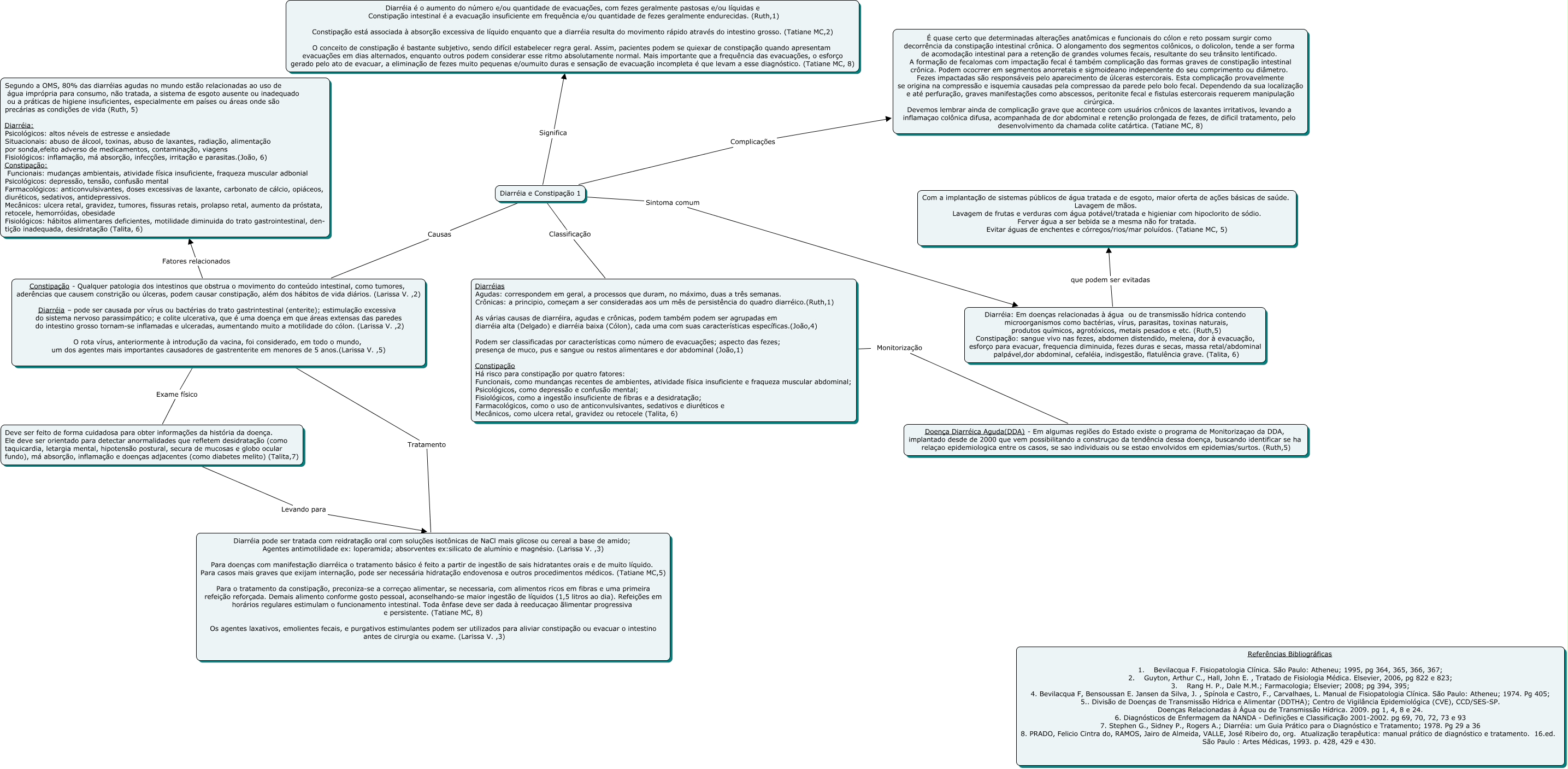 Esse mapa conceitual, produzido no IHMC CmapTools, tem a informação relacionada a: Diarréia e Constipação 1, Constipação - Qualquer patologia dos intestinos que obstrua o movimento do conteúdo intestinal, como tumores, aderências que causem constrição ou úlceras, podem causar constipação, além dos hábitos de vida diários. (Larissa V. ,2) Diarréia – pode ser causada por vírus ou bactérias do trato gastrintestinal (enterite); estimulação excessiva do sistema nervoso parassimpático; e colite ulcerativa, que é uma doença em que áreas extensas das paredes do intestino grosso tornam-se inflamadas e ulceradas, aumentando muito a motilidade do cólon. (Larissa V. ,2) O rota vírus, anteriormente à introdução da vacina, foi considerado, em todo o mundo, um dos agentes mais importantes causadores de gastrenterite em menores de 5 anos.(Larissa V. ,5) Tratamento Diarréia pode ser tratada com reidratação oral com soluções isotônicas de NaCl mais glicose ou cereal a base de amido; Agentes antimotilidade ex: loperamida; absorventes ex:silicato de alumínio e magnésio. (Larissa V. ,3) Para doenças com manifestação diarréica o tratamento básico é feito a partir de ingestão de sais hidratantes orais e de muito líquido. Para casos mais graves que exijam internação, pode ser necessária hidratação endovenosa e outros procedimentos médicos. (Tatiane MC,5) Para o tratamento da constipação, preconiza-se a correçao alimentar, se necessaria, com alimentos ricos em fibras e uma primeira refeição reforçada. Demais alimento conforme gosto pessoal, aconselhando-se maior ingestão de líquidos (1,5 litros ao dia). Refeições em horários regulares estimulam o funcionamento intestinal. Toda ênfase deve ser dada à reeducaçao ãlimentar progressiva e persistente. (Tatiane MC, 8) Os agentes laxativos, emolientes fecais, e purgativos estimulantes podem ser utilizados para aliviar constipação ou evacuar o intestino antes de cirurgia ou exame. (Larissa V. ,3), Diarréia e Constipação 1 Significa Diarréia é o aumento do número e/ou quantidade de evacuações, com fezes geralmente pastosas e/ou líquidas e Constipação intestinal é a evacuação insuficiente em frequência e/ou quantidade de fezes geralmente endurecidas. (Ruth,1) Constipação está associada à absorção excessiva de líquido enquanto que a diarréia resulta do movimento rápido através do intestino grosso. (Tatiane MC,2) O conceito de constipação é bastante subjetivo, sendo difícil estabelecer regra geral. Assim, pacientes podem se quiexar de constipação quando apresentam evacuações em dias alternados, enquanto outros podem considerar esse ritmo absolutamente normal. Mais importante que a frequência das evacuações, o esforço gerado pelo ato de evacuar, a eliminação de fezes muito pequenas e/oumuito duras e sensação de evacuação incompleta é que levam a esse diagnóstico. (Tatiane MC, 8), Diarréia e Constipação 1 Classificação Diarréias Agudas: correspondem em geral, a processos que duram, no máximo, duas a três semanas. Crônicas: a principio, começam a ser consideradas aos um mês de persistência do quadro diarréico.(Ruth,1) As várias causas de diarréira, agudas e crônicas, podem também podem ser agrupadas em diarréia alta (Delgado) e diarréia baixa (Cólon), cada uma com suas características específicas.(João,4) Podem ser classificadas por características como número de evacuações; aspecto das fezes; presença de muco, pus e sangue ou restos alimentares e dor abdominal (João,1) Constipação Há risco para constipação por quatro fatores: Funcionais, como mundanças recentes de ambientes, atividade física insuficiente e fraqueza muscular abdominal; Psicológicos, como depressão e confusão mental; Fisiológicos, como a ingestão insuficiente de fibras e a desidratação; Farmacológicos, como o uso de anticonvulsivantes, sedativos e diuréticos e Mecânicos, como ulcera retal, gravidez ou retocele (Talita, 6), Diarréia e Constipação 1 Causas Constipação - Qualquer patologia dos intestinos que obstrua o movimento do conteúdo intestinal, como tumores, aderências que causem constrição ou úlceras, podem causar constipação, além dos hábitos de vida diários. (Larissa V. ,2) Diarréia – pode ser causada por vírus ou bactérias do trato gastrintestinal (enterite); estimulação excessiva do sistema nervoso parassimpático; e colite ulcerativa, que é uma doença em que áreas extensas das paredes do intestino grosso tornam-se inflamadas e ulceradas, aumentando muito a motilidade do cólon. (Larissa V. ,2) O rota vírus, anteriormente à introdução da vacina, foi considerado, em todo o mundo, um dos agentes mais importantes causadores de gastrenterite em menores de 5 anos.(Larissa V. ,5), Diarréias Agudas: correspondem em geral, a processos que duram, no máximo, duas a três semanas. Crônicas: a principio, começam a ser consideradas aos um mês de persistência do quadro diarréico.(Ruth,1) As várias causas de diarréira, agudas e crônicas, podem também podem ser agrupadas em diarréia alta (Delgado) e diarréia baixa (Cólon), cada uma com suas características específicas.(João,4) Podem ser classificadas por características como número de evacuações; aspecto das fezes; presença de muco, pus e sangue ou restos alimentares e dor abdominal (João,1) Constipação Há risco para constipação por quatro fatores: Funcionais, como mundanças recentes de ambientes, atividade física insuficiente e fraqueza muscular abdominal; Psicológicos, como depressão e confusão mental; Fisiológicos, como a ingestão insuficiente de fibras e a desidratação; Farmacológicos, como o uso de anticonvulsivantes, sedativos e diuréticos e Mecânicos, como ulcera retal, gravidez ou retocele (Talita, 6) Monitorização Doença Diarréica Aguda(DDA) - Em algumas regiões do Estado existe o programa de Monitorizaçao da DDA, implantado 