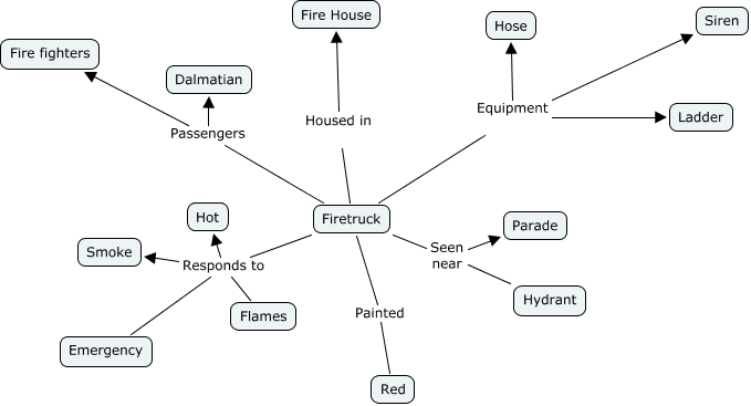 This Concept Map, created with IHMC CmapTools, has information related to: Firetruck, Firetruck Seen near Parade, Firetruck Equipment Hose, Firetruck Seen near Hydrant, Firetruck Responds to Flames, Firetruck Passengers Dalmatian, Firetruck Passengers Fire fighters, Firetruck Responds to Smoke, Firetruck Equipment Siren, Firetruck Painted Red, Firetruck Responds to Emergency, Firetruck Housed in Fire House, Firetruck Responds to Hot, Firetruck Equipment Ladder