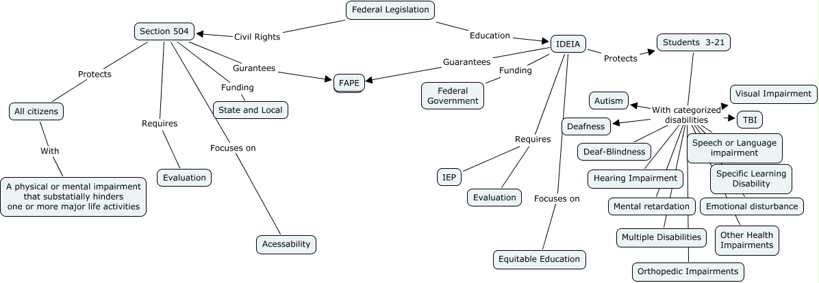 This Concept Map, created with IHMC CmapTools, has information related to: 504IDEIA, Students 3-21 With categorized disabilities Emotional disturbance, IDEIA Funding Federal Government, Students 3-21 With categorized disabilities Visual Impairment, Students 3-21 With categorized disabilities Mental retardation, Section 504 Protects All citizens, Students 3-21 With categorized disabilities Deaf-Blindness, IDEIA Guarantees ????, Students 3-21 With categorized disabilities Deafness, Students 3-21 With categorized disabilities Multiple Disabilities, Federal Legislation Education IDEIA, All citizens With A physical or mental impairment that substatially hinders one or more major life activities, Students 3-21 With categorized disabilities Specific Learning Disability, Students 3-21 With categorized disabilities TBI, Section 504 Gurantees FAPE, IDEIA Requires Evaluation, Students 3-21 With categorized disabilities Other Health Impairments, IDEIA Protects Students 3-21, Students 3-21 With categorized disabilities Orthopedic Impairments, Section 504 Requires Evaluation, Section 504 Focuses on Acessability