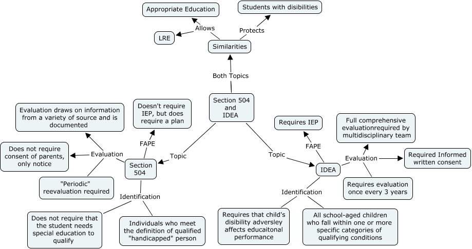 This Concept Map, created with IHMC CmapTools, has information related to: IDEA and Section 504, Section 504 and IDEA Topic IDEA, Similarities Protects Students with disibilities, IDEA Identification All school-aged children who fall within one or more specific categories of qualifying conditions, IDEA Identification Requires that child's disibility adversley affects educaitonal performance, IDEA Evaluation Full comprehensive evaluationrequired by multidisciplinary team, Section 504 Evaluation Does not require consent of parents, only notice, Section 504 Evaluation Evaluation draws on information from a variety of source and is documented, Similarities Allows LRE, IDEA Evaluation Required Informed written consent, IDEA FAPE Requires IEP, Section 504 and IDEA Both Topics Similarities, Section 504 Identification Does not require that the student needs special education to qualify, Section 504 Identification Individuals who meet the definition of qualified "handicapped" person, Section 504 and IDEA Topic Section 504, Similarities Allows Appropriate Education, Section 504 FAPE Doesn't require IEP, but does require a plan, Section 504 Evaluation "Periodic" reevaluation required, IDEA Evaluation Requires evaluation once every 3 years, Section 504 and IDEA Both Topics Similarities