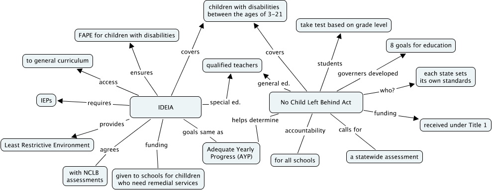 This Concept Map, created with IHMC CmapTools, has information related to: NCLBandIDEIAcomparisonLizBrown, No Child Left Behind Act students take test based on grade level, No Child Left Behind Act covers children with disabilities between the ages of 3-21, No Child Left Behind Act governers developed 8 goals for education, IDEIA provides Least Restrictive Environment, IDEIA requires IEPs, IDEIA funding given to schools for chilldren who need remedial services, IDEIA agrees with NCLB assessments, IDEIA covers children with disabilities between the ages of 3-21, No Child Left Behind Act calls for a statewide assessment, IDEIA ensures FAPE for children with disabilities, No Child Left Behind Act general ed. qualified teachers, No Child Left Behind Act funding received under Title 1, IDEIA goals same as Adequate Yearly Progress (AYP), No Child Left Behind Act who? each state sets its own standards, No Child Left Behind Act helps determine Adequate Yearly Progress (AYP), IDEIA access to general curriculum, IDEIA special ed. qualified teachers, No Child Left Behind Act accountability for all schools