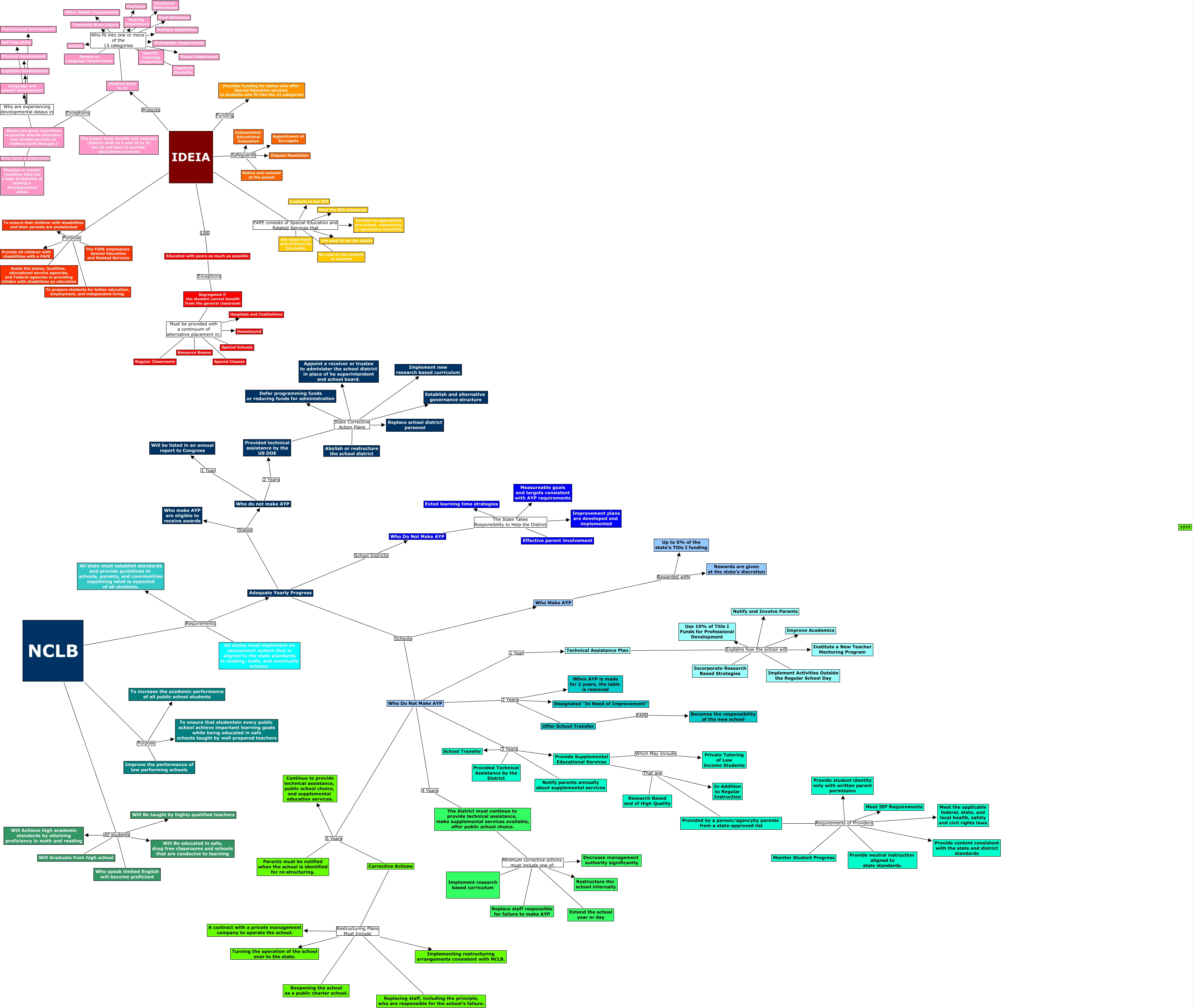This Concept Map, created with IHMC CmapTools, has information related to: IDEIA vs. NCLB, Who Do Not Make AYP The State Takes Responsibility to Help the District Improvement plans are developed and implemented, Who Make AYP Rewarded with Up to 5% of the state's Title I funding, IDEIA FAPE consists of Special Education and Related Services that Conform to the IEP, Segregated if the student cannot benefit from the general classroom Must be provided with a continuum of alternative placement in: Hospitals and Institutions, States are given incentives to provide special education and related services to children birth through 2 Who are experiencing developmental delays in Self help skills, Provided technical assistance by the US DOE State Corrective Action Plans Defer programming funds or reducing funds for administration, The district must continue to provide technical assistance, make supplemental services available, offer public school choice. Minimum corrective actions must include one of: Restructure the school internally, Technical Assistance Plan Explains how the school will Use 10% of Title I Funds for Professional Development, Segregated if the student cannot benefit from the general classroom Must be provided with a continuum of alternative placement in: Regular Classrooms, Provide Supplemental Educational Services That are Provided by a person/agencyby parents from a state-approved list, States are given incentives to provide special education and related services to children birth through 2 Who are experiencing developmental delays in Physical development, IDEIA LRE Educated with peers as much as possible, Children birth to 21 Who fit into one or more of the 13 categories Emotional Disturbance, NCLB All students Will Be taught by highly qualified teachers, Provided technical assistance by the US DOE State Corrective Action Plans Establish and alternative governance structure, Adequate Yearly Progress States Who make AYP are eligible to receive awards, IDEIA Purpose To prepare students for futher education, employment, and independent living., NCLB Purpose To ensure that studentsin every public school achieve important learning goals while being educated in safe schools taught by well prepared teachers, Provided by a person/agencyby parents from a state-approved list Requirements of Providers Monitor Student Progress, Children birth to 21 Exceptions States are given incentives to provide special education and related services to children birth through 2