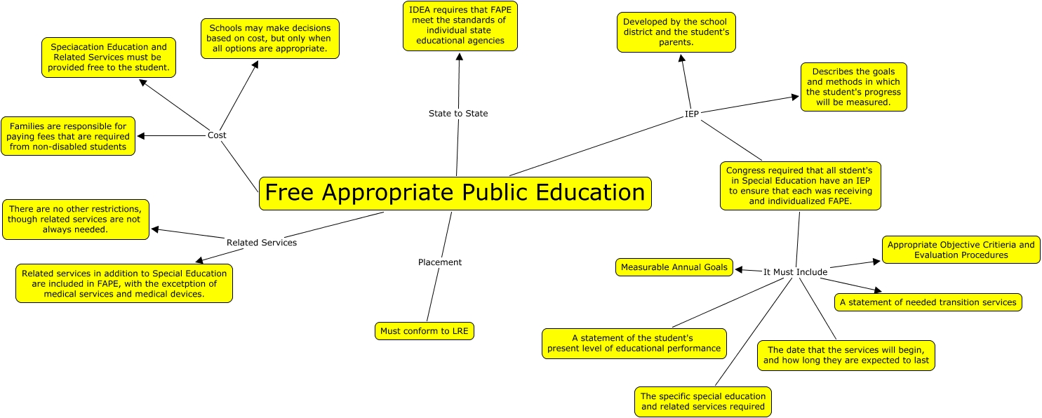 This Concept Map, created with IHMC CmapTools, has information related to: FAPE, Free Appropriate Public Education State to State IDEA requires that FAPE meet the standards of individual state educational agencies, Congress required that all stdent's in Special Education have an IEP to ensure that each was receiving and individualized FAPE. It Must Include A statement of the student's present level of educational performance, Free Appropriate Public Education IEP Describes the goals and methods in which the student's progress will be measured., Free Appropriate Public Education Cost Speciacation Education and Related Services must be provided free to the student., Free Appropriate Public Education Related Services There are no other restrictions, though related services are not always needed., Congress required that all stdent's in Special Education have an IEP to ensure that each was receiving and individualized FAPE. It Must Include A statement of needed transition services, Free Appropriate Public Education Placement Must conform to LRE, Congress required that all stdent's in Special Education have an IEP to ensure that each was receiving and individualized FAPE. It Must Include Measurable Annual Goals, Congress required that all stdent's in Special Education have an IEP to ensure that each was receiving and individualized FAPE. It Must Include Appropriate Objective Critieria and Evaluation Procedures, Free Appropriate Public Education IEP Developed by the school district and the student's parents., Free Appropriate Public Education Related Services Related services in addition to Special Education are included in FAPE, with the excetption of medical services and medical devices., Free Appropriate Public Education Cost Schools may make decisions based on cost, but only when all options are appropriate., Free Appropriate Public Education IEP Congress required that all stdent's in Special Education have an IEP to ensure that each was receiving and individualized FAPE., Congress required that all stdent's in Special Education have an IEP to ensure that each was receiving and individualized FAPE. It Must Include The date that the services will begin, and how long they are expected to last, Free Appropriate Public Education Cost Families are responsible for paying fees that are required from non-disabled students, Congress required that all stdent's in Special Education have an IEP to ensure that each was receiving and individualized FAPE. It Must Include The specific special education and related services required