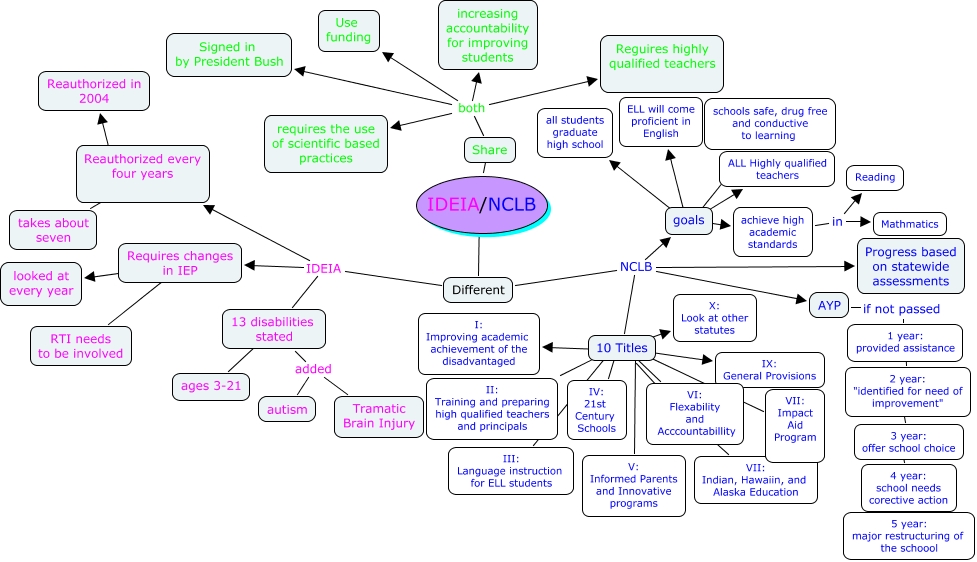 This Concept Map, created with IHMC CmapTools, has information related to: IDEIA vs. NCLB, Share both increasing accountability for improving students, Different NCLB goals, Share both Reguires highly qualified teachers, 1 year: provided assistance ???? 2 year: "identified for need of improvement", 13 disabilities stated added Tramatic Brain Injury, 13 disabilities stated added autism, Share both requires the use of scientific based practices, Share both Signed in by President Bush, 2 year: "identified for need of improvement" ???? 3 year: offer school choice, IDEIA/NCLB ???? Share, 10 Titles ???? IX: General Provisions, 10 Titles ???? III: Language instruction for ELL students, Different NCLB AYP, 10 Titles ???? VII: Indian, Hawaiin, and Alaska Education, 10 Titles ???? X: Look at other statutes, 10 Titles ???? VI: Flexability and Acccountabillity, Requires changes in IEP ???? RTI needs to be involved, Different IDEIA Reauthorized every four years, 10 Titles ???? IV: 21st Century Schools, 10 Titles ???? I: Improving academic achievement of the disadvantaged