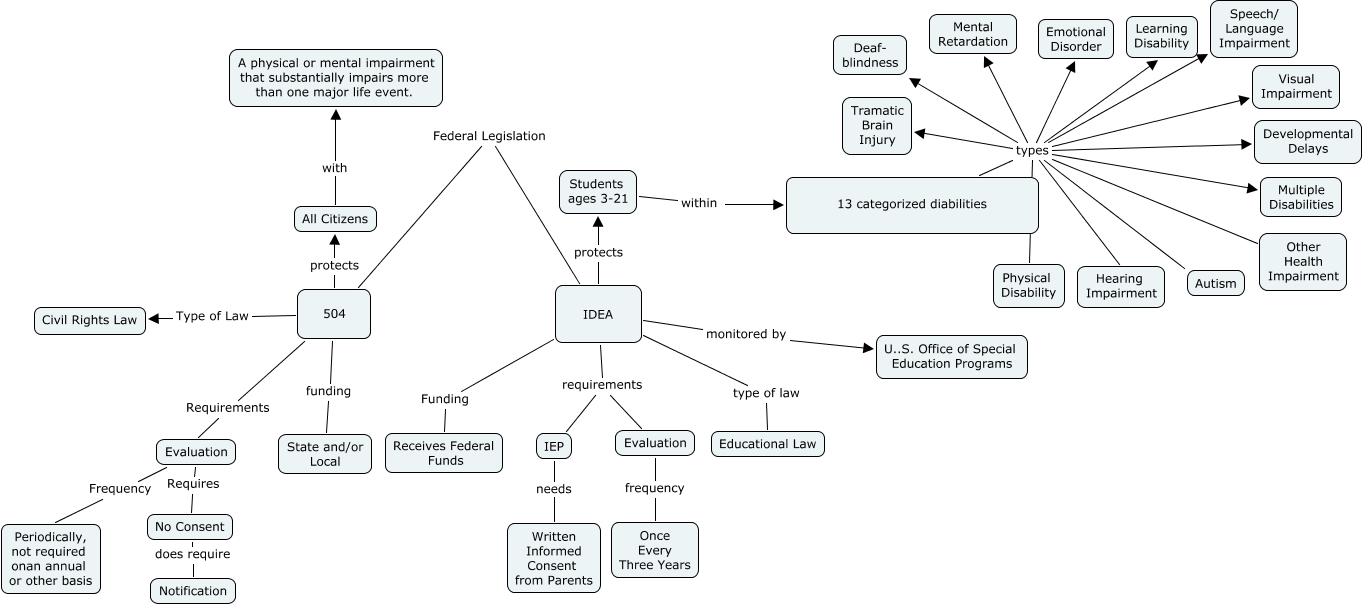 This Concept Map, created with IHMC CmapTools, has information related to: IDEA_504 CMAP, No Consent does require Notification, IDEA monitored by U..S. Office of Special Education Programs, Evaluation Frequency Periodically, not required onan annual or other basis, 13 categorized diabilities types Autism, Evaluation frequency Once Every Three Years, 13 categorized diabilities types Multiple Disabilities, 13 categorized diabilities types Speech/ Language Impairment, 504 Type of Law Civil Rights Law, 13 categorized diabilities types Developmental Delays, 504 funding State and/or Local, 13 categorized diabilities types Hearing Impairment, 13 categorized diabilities types Learning Disability, IDEA type of law Educational Law, 504 Federal Legislation IDEA, 13 categorized diabilities types Physical Disability, Students ages 3-21 within 13 categorized diabilities, 13 categorized diabilities types Tramatic Brain Injury, IDEA protects Students ages 3-21, 13 categorized diabilities types Mental Retardation, IDEA requirements IEP