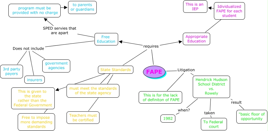 This Concept Map, created with IHMC CmapTools, has information related to: FAPE, Idividualized FAPE for each student ???? This is an IEP, FAPE requires Appropriate Education, Free Education Does not include insurers, Hendrick Hudson School District vs. Rowely taken To Federal court, FAPE Litigation Hendrick Hudson School District vs. Rowely, Free Education Does not include government agencies, This is given to the state rather than the Federal Government ???? Free to impose more demanding standards, Hendrick Hudson School District vs. Rowely when? 1982, FAPE Litigation This is for the lack of definiton of FAPE, State Standards ???? Teachers must be certified, program must be provided with no charge ???? to parents or guardians, State Standards ???? must meet the standards of the state agency, State Standards ???? This is given to the state rather than the Federal Government, Free Education SPED servies that are apart program must be provided with no charge, FAPE requires Free Education, Free Education Does not include 3rd party payers, Hendrick Hudson School District vs. Rowely result "basic floor of opportunity, Appropriate Education ???? Idividualized FAPE for each student, FAPE requires State Standards