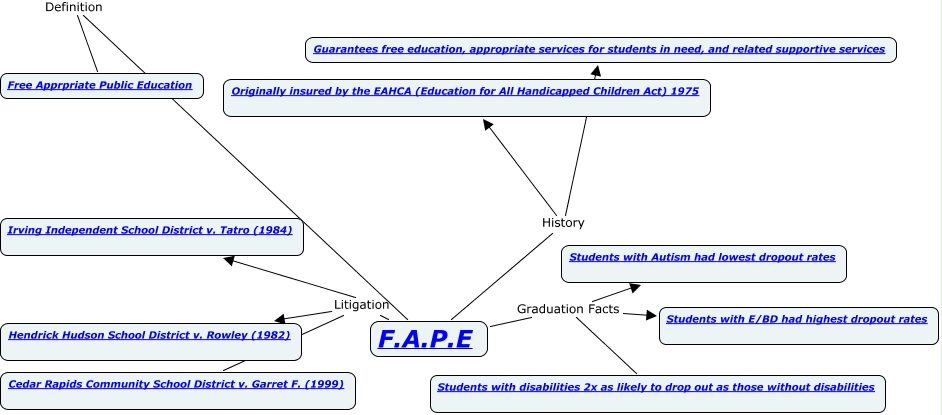 This Concept Map, created with IHMC CmapTools, has information related to: FAPE, F.A.P.E History Guarantees free education, appropriate services for students in need, and related supportive services, F.A.P.E Definition Free Apprpriate Public Education, F.A.P.E Graduation Facts Students with Autism had lowest dropout rates, F.A.P.E Litigation Irving Independent School District v. Tatro (1984), F.A.P.E Litigation Hendrick Hudson School District v. Rowley (1982), F.A.P.E Graduation Facts Students with E/BD had highest dropout rates, F.A.P.E History Originally insured by the EAHCA (Education for All Handicapped Children Act) 1975, F.A.P.E Graduation Facts Students with disabilities 2x as likely to drop out as those without disabilities, F.A.P.E Litigation Cedar Rapids Community School District v. Garret F. (1999)