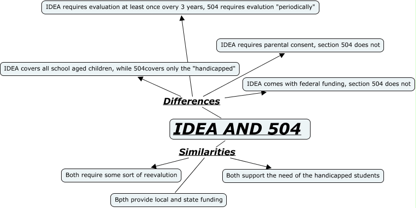 This Concept Map, created with IHMC CmapTools, has information related to: IDEA and 504, IDEA AND 504 Differences IDEA requires evaluation at least once overy 3 years, 504 requires evalution "periodically", IDEA AND 504 Differences IDEA requires parental consent, section 504 does not, IDEA AND 504 Similarities Both require some sort of reevalution, IDEA AND 504 Similarities Bpth provide local and state funding, IDEA AND 504 Similarities Both support the need of the handicapped students, IDEA AND 504 Differences IDEA covers all school aged children, while 504covers only the "handicapped", IDEA AND 504 Differences IDEA comes with federal funding, section 504 does not