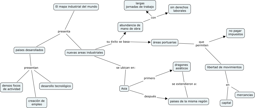 Este Cmap, tiene información relacionada con: mapa industrial del mundo, nuevas areas industriales se ubican en: Asia, El mapa industrial del mundo presenta paises desarollados, libertad de movimientos en mercancias, áreas portuarias que permiten libertad de movimientos, paises desarollados presentan creación de empleo, nuevas areas industriales su éxito se basa áreas portuarias, El mapa industrial del mundo presenta nuevas areas industriales, Asia primero dragones asiáticos, paises desarollados presentan densos focos de actividad, paises desarollados presentan desarollo tecnológico, áreas portuarias que permiten no pagar impuestos, dragones asiáticos se extendieron a: paises de la misma región, abundancia de mano de obra con sin derechos laborales, nuevas areas industriales su éxito se basa abundancia de mano de obra, Asia después paises de la misma región, abundancia de mano de obra con largas jornadas de trabajo, libertad de movimientos en capital