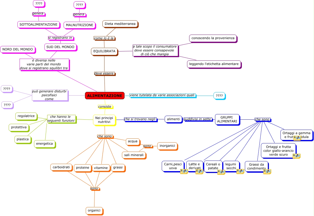 Questa Cmap, creata con IHMC CmapTools, contiene informazioni relative a: ALIMENTAZIONE Perna-Soranno crretta da Licci, Nei principi nutritivi che sono vitamine, EQUILIBRATA a tale scopo il consumatore deve essere consapevole di ciò che mangia conoscendo la provenienza, alimenti suddivisi in sette GRUPPI ALIMENTARI, ALIMENTAZIONE consiste Nei principi nutritivi, SOTTOALIMENTAZIONE genera ????, grassi sono organici, ALIMENTAZIONE è diversa nelle varie parti del mondo dove si registrano squilibri tra SUD DEL MONDO, SUD DEL MONDO si registrano in SOTTOALIMENTAZIONE, Nei principi nutritivi che sono acqua, EQUILIBRATA come lo è la Dieta mediterranea, ALIMENTAZIONE viene tutelata da varie associazioni quali ????, vitamine sono organici, SUD DEL MONDO si registrano in MALNUTRIZIONE, carboidrati sono organici, proteine sono organici, Nei principi nutritivi che sono proteine, Nei principi nutritivi che hanno le seguenti funzioni plastica, ALIMENTAZIONE deve essere EQUILIBRATA, sali minerali sono inorganici, GRUPPI ALIMENTARI che sono Carni,pesci uova